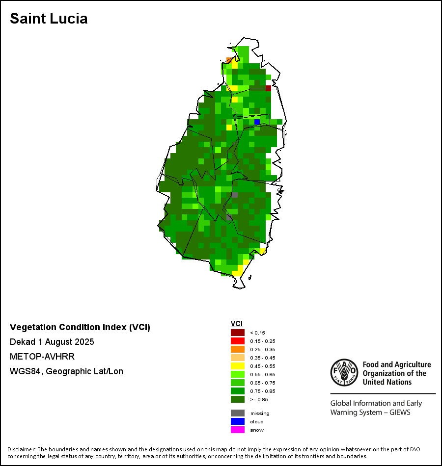 The Vegetation Condition Index (VCI) evaluates the current vegetation health in comparison to the historical trends. The VCI relates current dekadal Normalized Difference Vegetation Index (NDVI) to its long-term minimum and maximum, normalized by the historical range of NDVI values for the same dekad. The VCI was designed to separate the weather-related component of the NDVI from the ecological element.