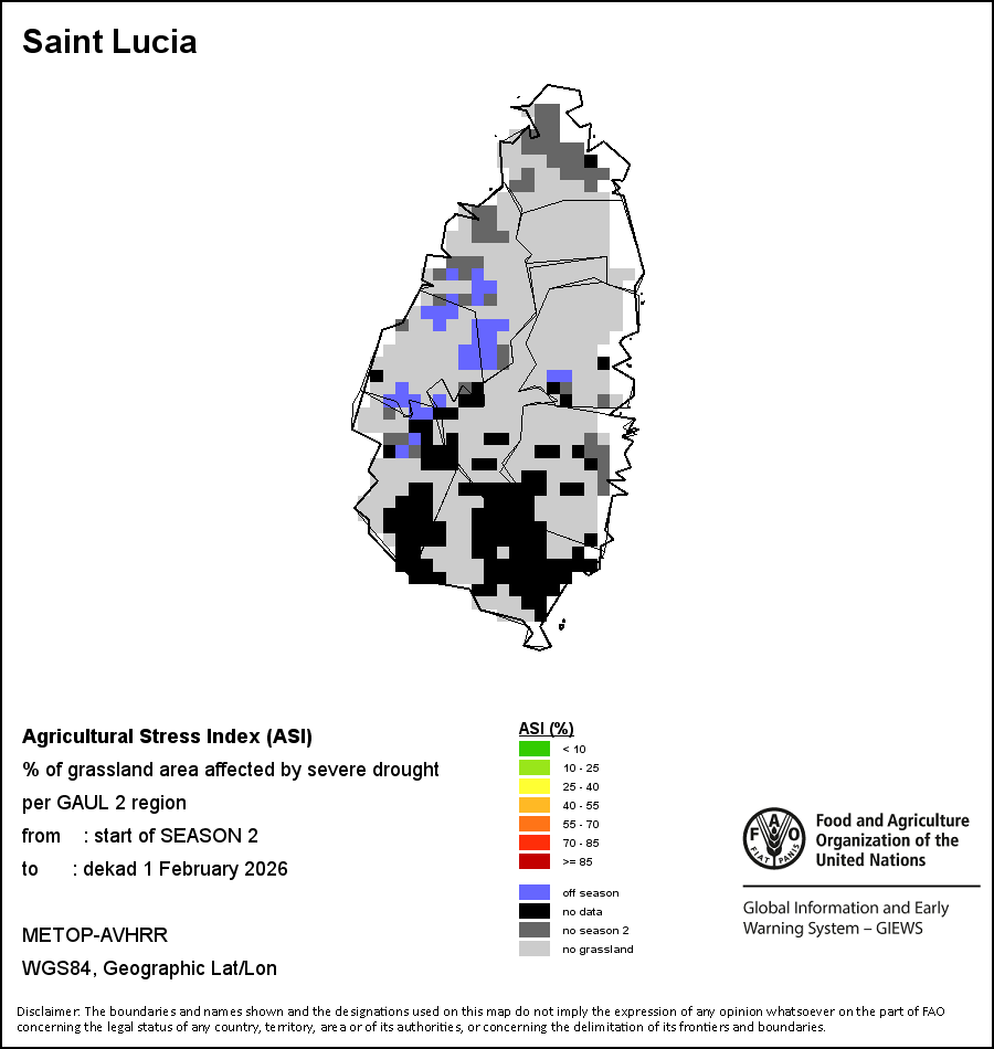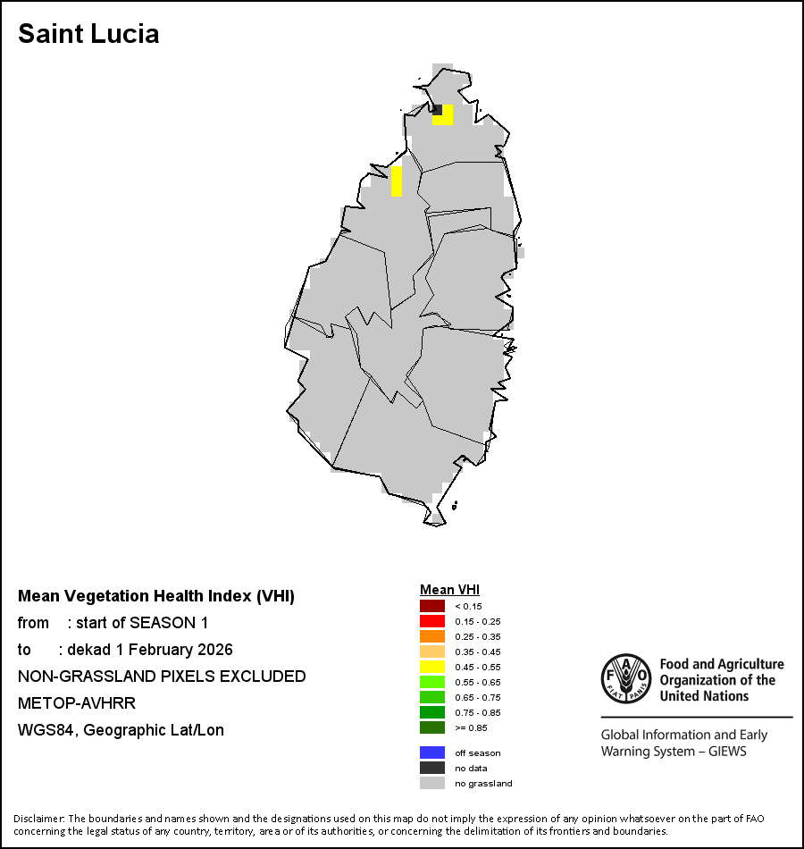 Los mapas y gráficos nacionales representan el último periodo de 36 meses de los indicadores estacionales, de vegetación y de precipitación. Los datos se presentan por periodos de 10 días y por meses. Los tres indicadores de vegetación se basan en datos de vegetación registrados cada diez días por el sensor METOP-AVHRR con una resolución de 1km (2007 y posterior). Los datos con una resolución de 1km del período 1984-2006 se extrapolaron a partir del conjunto de datos NOAA-AVHRR con 16km de resolución. Las estimaciones de precipitación de todos los países africanos (excepto Cabo Verde y Mauricio) se obtienen de NOAA/FEWSNet (16km de resolución), mientras que para los restantes países los datos se obtienen Centro Europeo de Predicción Meteorológica a Plazo Medio (ECMWF siglas en Inglés, 25km de resolución). Debido a la mayor resolución de los indicadores de vegetación (p.ej., NDVI, VHI) en comparación con los indicadores de precipitación de resolución más gruesa, el número de unidades subnacionales para las que se pueden generar estadísticas zonales válidas para los índices de vegetación es mayor que el número de unidades para los indicadores de precipitación en algunos países.