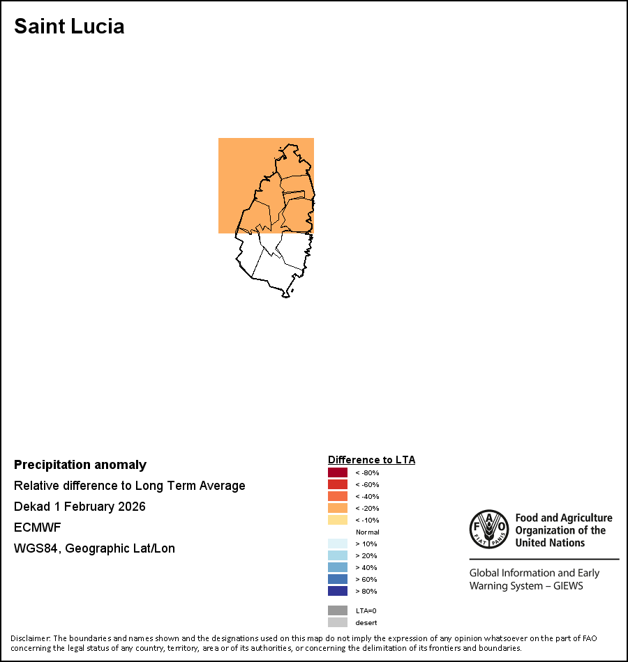 El Índice Normalizado Diferencial de la Vegetación (NDVI, por sus siglas en inglés) mide el “verdor” de la cubierta vegetal, y se utiliza como indicador de la densidad y salud de la vegetación. Los valores del NDVI oscilan entre +1 y -1. Los valores positivos elevados corresponden a vegetación densa y saludable, mientras que los valores bajos y/o negativos reflejan condiciones deficientes de vegetación o cubierta vegetal escasa. La anomalía del NDVI representa la variación del periodo actual de 10 días con respecto al valor medio a largo plazo. Un valor positivo (por ejemplo, 20 por ciento) implicaría mejores condiciones de vegetación con respecto a la media, mientras que un valor negativo (por ejemplo, -40 por ciento) indicaría condiciones de vegetación comparativamente peores.