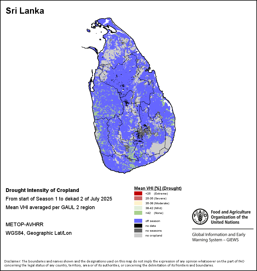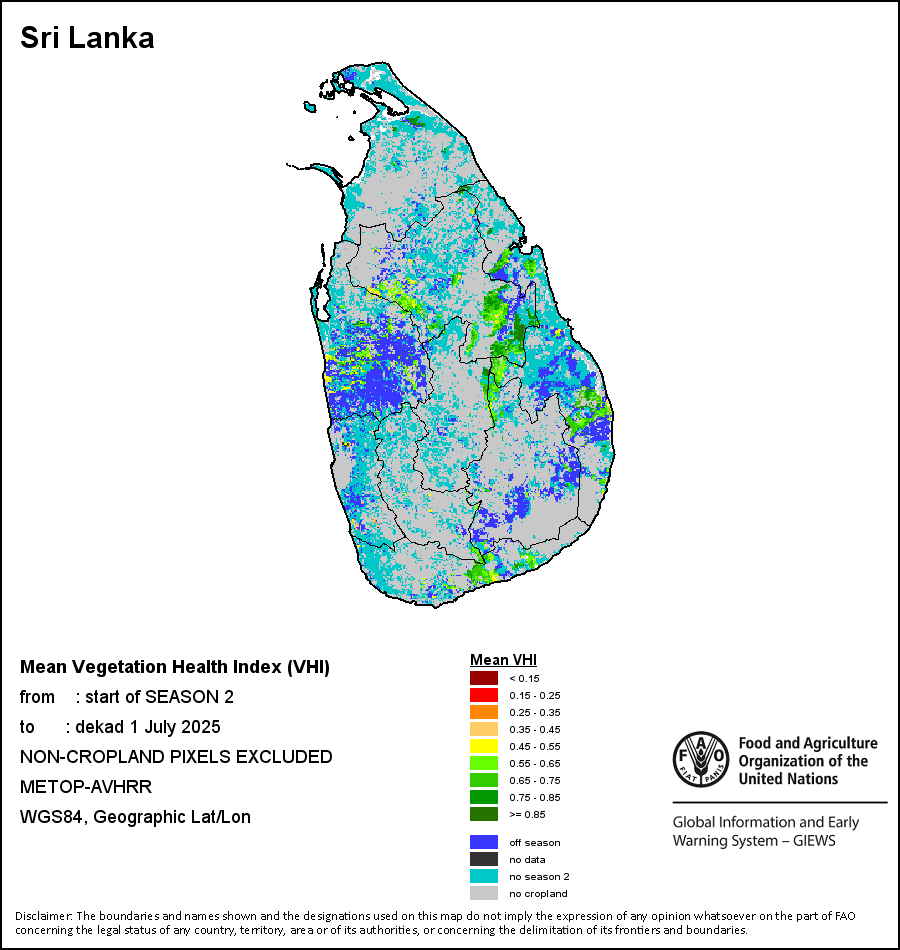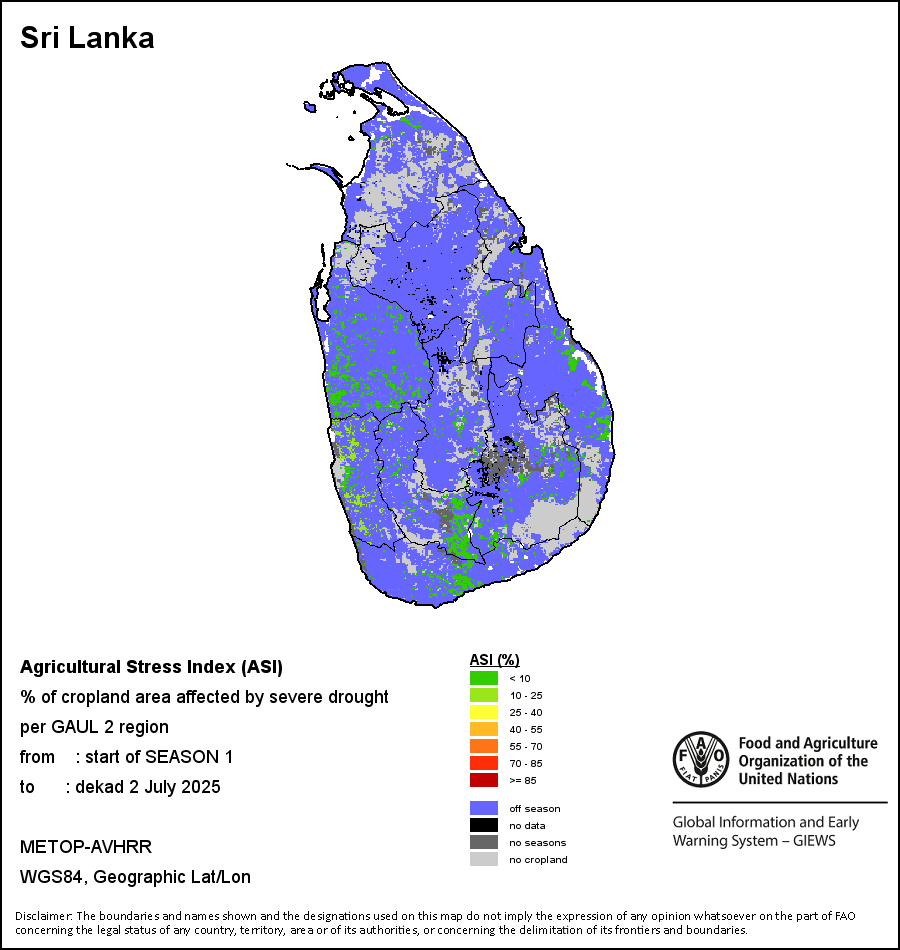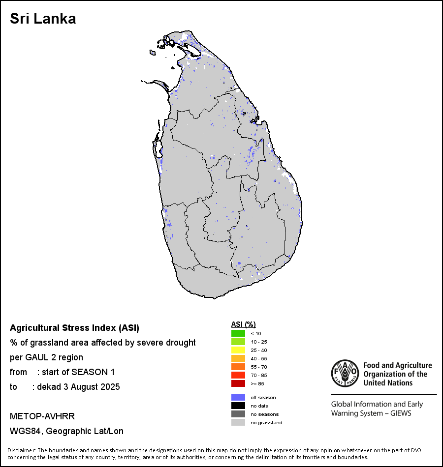 The Agricultural Stress Index (ASI) is a quick-look indicator that facilitates the early identification of cropped land with a high likelihood of water stress (drought). The Index is based on the integration of the Vegetation Health Index (VHI) in two dimensions that are critical in the assessment of a drought event in agriculture: temporal and spatial. The first step of the ASI calculation is a temporal averaging of the VHI, assessing the intensity and duration of dry periods occurring during the crop cycle at the pixel level; this calculation includes the use of crop coefficients, which introduces sensitivity of a crop to water stress during each phenological phase. The second step determines the spatial extent of drought events by calculating the percentage of pixels in arable areas with a VHI value below 35 percent (this value was identified as a critical threshold in assessing the extent of drought in previous research by Kogan, 1995). Each administrative area is classified according to the percentage of the affected area to facilitate the quick interpretation of results.