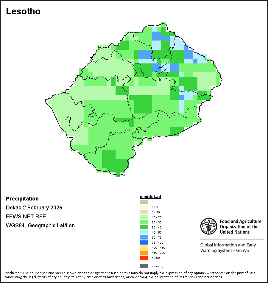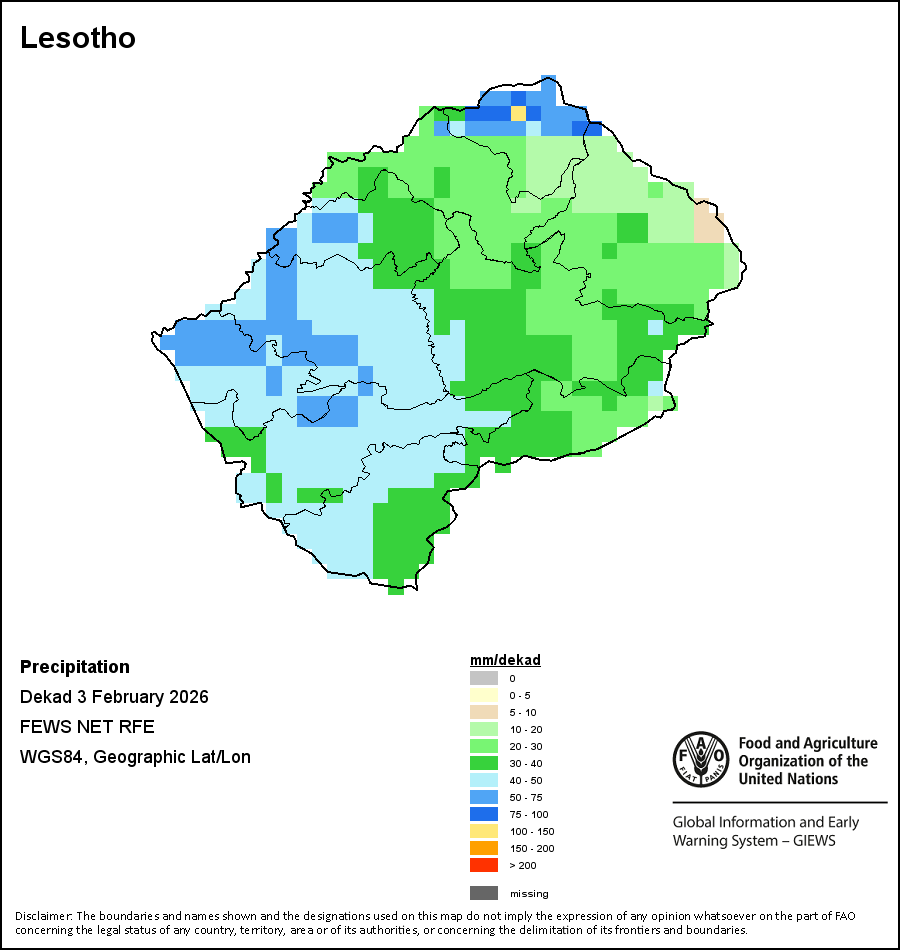 La carte illustre les volumes cumulés de précipitations au cours d’une décade (une période de 10 jours). Les estimations concernant les précipitations pour tous les pays africains (à l'exception du Cap Vert et de Maurice) proviennent du NOAA/FEWSNet, tandis que les données concernant les autres pays sont obtenues à partir du CEPMMT.