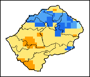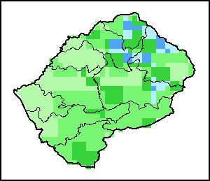 L'indice de végétation par différence normalisé (NDVI – Normalized Difference Vegetation Index) mesure la "verdeur" de la couverture du sol, et est utilisé comme indicateur de la densité et de l’état de la végétation. Les valeurs du NDVI varient de +1 à -1, plus les valeurs positives sont élevées plus la végétation est dense et en bonne santé, tandis que des valeurs faibles et/ou négatives du NDVI indiquent une végétation en mauvaises conditions ou une couverture végétale clairsemée. L’écart NDVI indique la variation de la décade actuelle par rapport à la moyenne à long terme. Une valeur positive (par exemple 20 pour cent) indique une amélioration des conditions de végétation par rapport à la moyenne, tandis qu'une valeur négative (par exemple -40 pour cent) signale des conditions de végétation relativement mauvaises.
