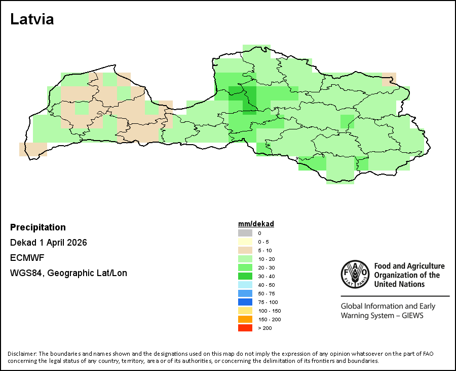 На карте изображены кумулятивные объемы осадков в декаду (10-дневный период). Оценки атмосферных осадков для всех африканских стран (за исключением Кабо-Верде и Маврикия) получены из системы NOAA/Системы раннего предупреждения об опасности голода, а по остальным странам данные получены из системы ECMWF.