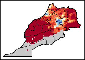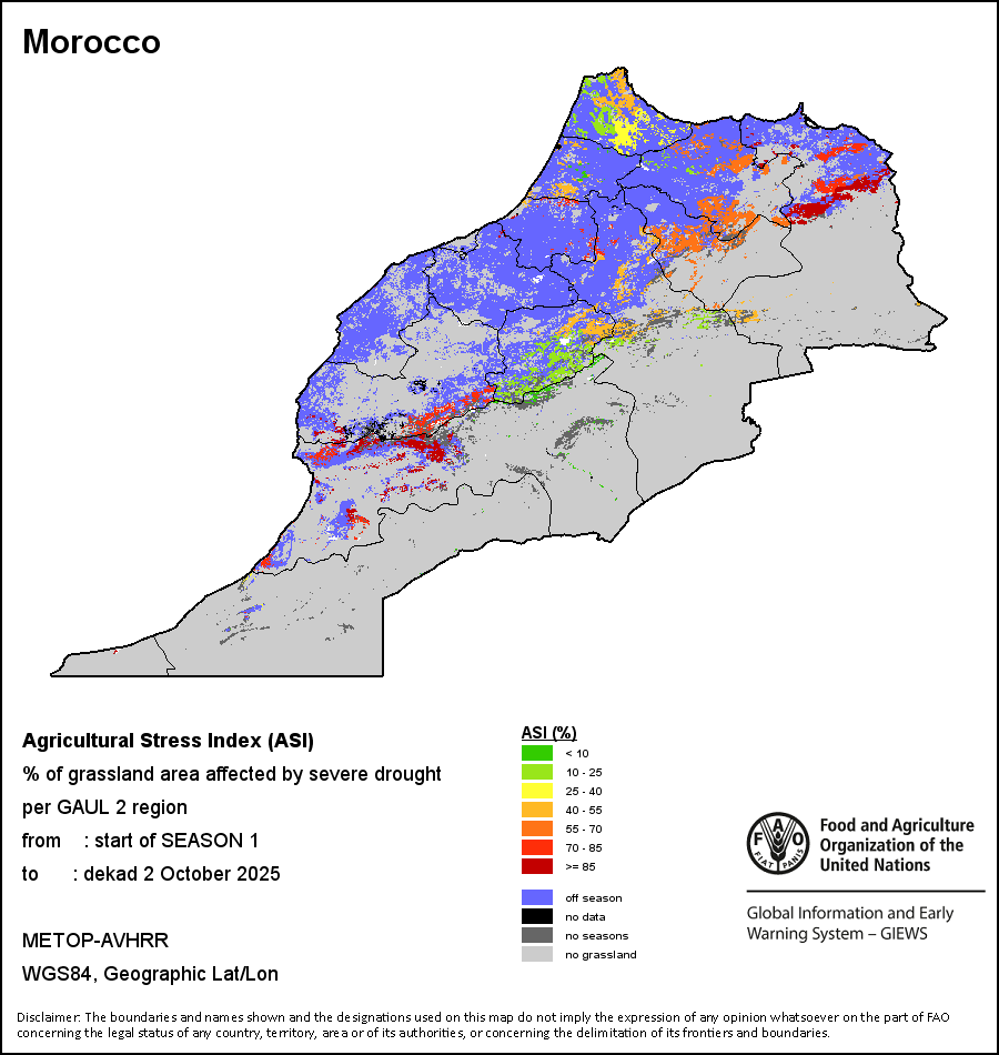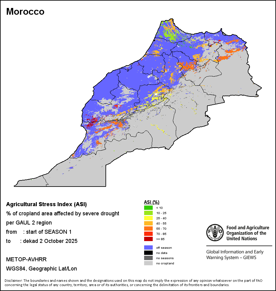 The Agricultural Stress Index (ASI) is a quick-look indicator that facilitates the early identification of cropped land with a high likelihood of water stress (drought). The Index is based on the integration of the Vegetation Health Index (VHI) in two dimensions that are critical in the assessment of a drought event in agriculture: temporal and spatial. The first step of the ASI calculation is a temporal averaging of the VHI, assessing the intensity and duration of dry periods occurring during the crop cycle at the pixel level; this calculation includes the use of crop coefficients, which introduces sensitivity of a crop to water stress during each phenological phase. The second step determines the spatial extent of drought events by calculating the percentage of pixels in arable areas with a VHI value below 35 percent (this value was identified as a critical threshold in assessing the extent of drought in previous research by Kogan, 1995). Each administrative area is classified according to the percentage of the affected area to facilitate the quick interpretation of results.