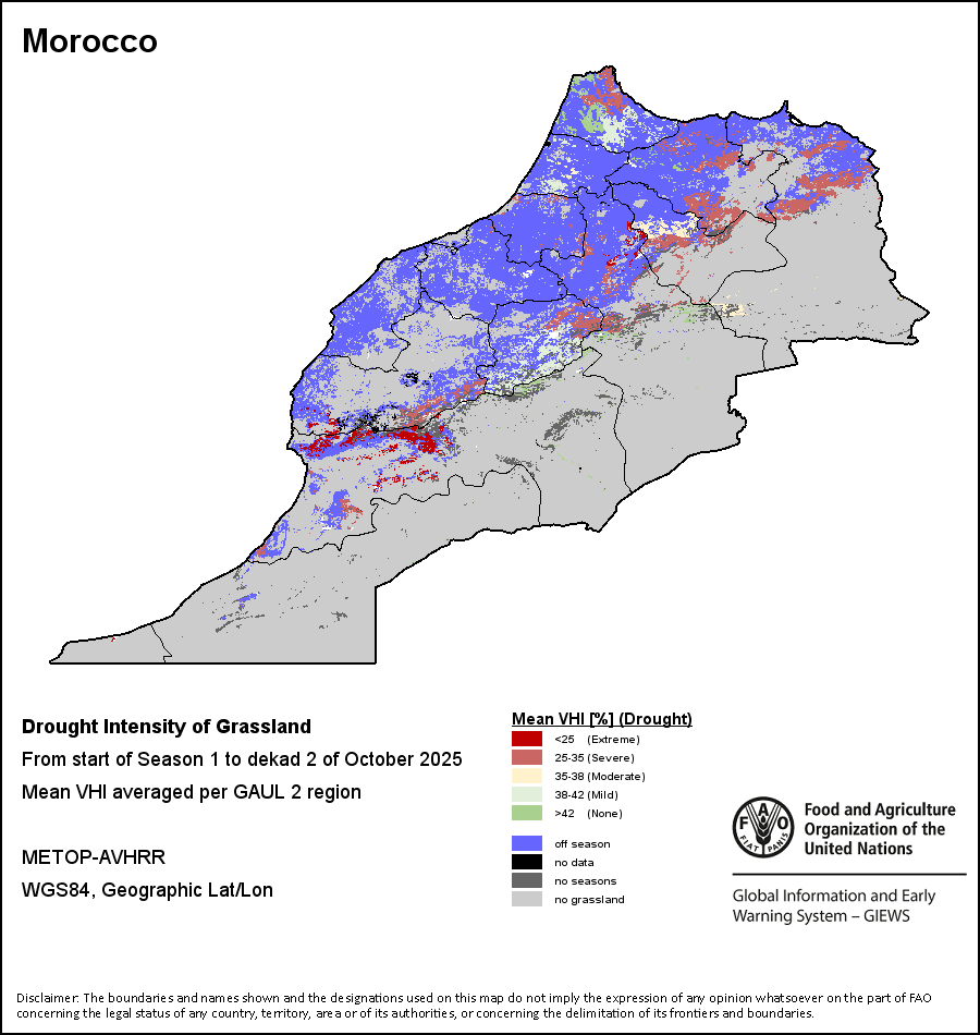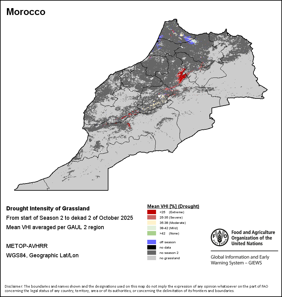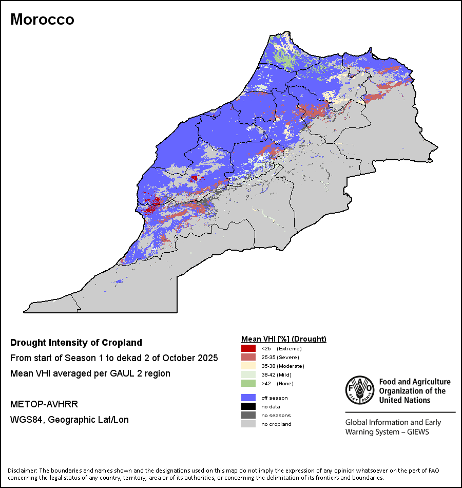 Agricultural droughts are classified by their intensity and are categorized into four classes: Extreme, Severe, Moderate or Mild. The intensity of the drought is calculated through the Weighted Mean Vegetation Health Index aggregated per GAUL 2 region, indicating that the poorer the vegetation health the more severe the drought.