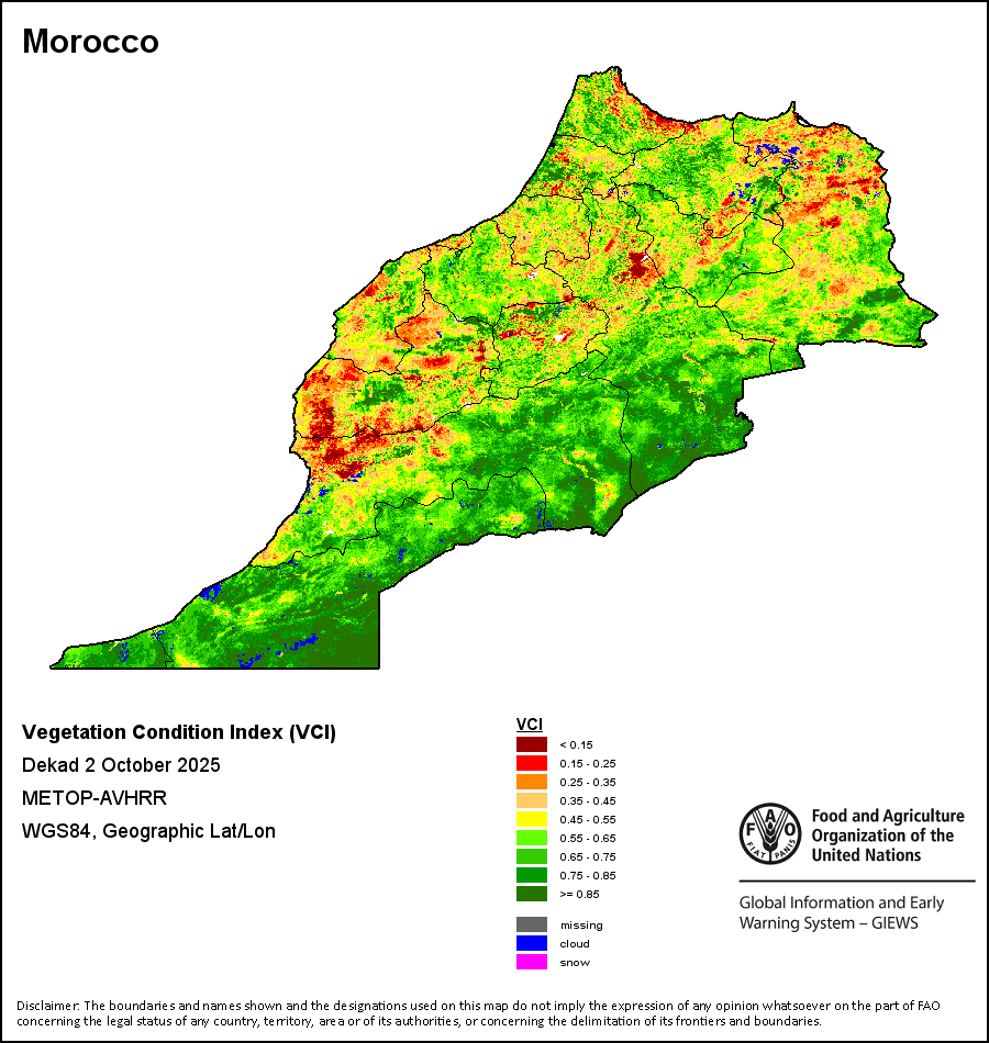 The Vegetation Condition Index (VCI) evaluates the current vegetation health in comparison to the historical trends. The VCI relates current dekadal Normalized Difference Vegetation Index (NDVI) to its long-term minimum and maximum, normalized by the historical range of NDVI values for the same dekad. The VCI was designed to separate the weather-related component of the NDVI from the ecological element.