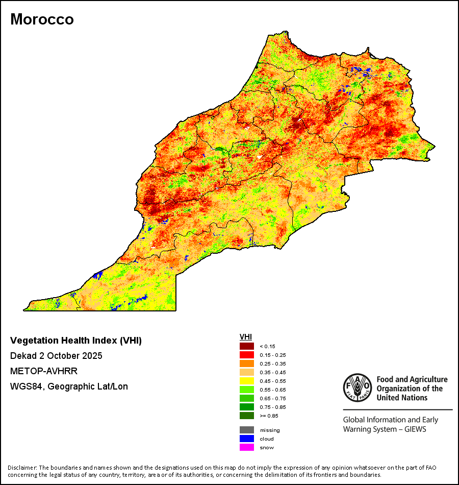 The Vegetation Health Index (VHI) illustrates the severity of drought based on the vegetation health and the influence of temperature on plant conditions. The VHI is a composite index and the elementary indicator used to compute the ASI. It combines both the Vegetation Condition Index (VCI) and the Temperature Condition Index (TCI). The TCI is calculated using a similar equation to the VCI, but relates the current temperature to the long-term maximum and minimum , as it is assumed that higher temperatures tend to cause a deterioration in vegetation conditions. A decrease in the VHI would, for example, indicate relatively poor vegetation conditions and warmer temperatures, signifying stressed vegetation conditions, and over a longer period would be indicative of drought. The VHI images are computed for the two main seasons and in three modalities: dekadal, monthly and annual.