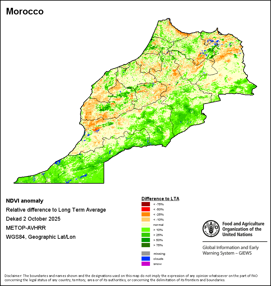 The Normalized Difference Vegetation Index (NDVI) measures the “greenness” of ground cover and is used as a proxy to indicate the density and health of vegetation. NDVI values range from +1 to -1, with high positive values corresponding to dense and healthy vegetation, and low and/or negative NDVI values indicating poor vegetation conditions or sparse vegetative cover. The NDVI anomaly indicates the variation of the current dekad to the long-term average, where a positive value (for example 20 percent) would signify enhanced vegetation conditions compared to the average, while a negative value (for instance -40 percent) would indicate comparatively poor vegetation conditions.