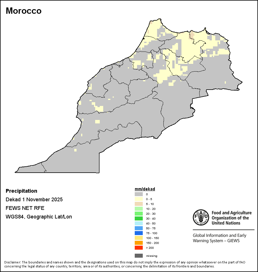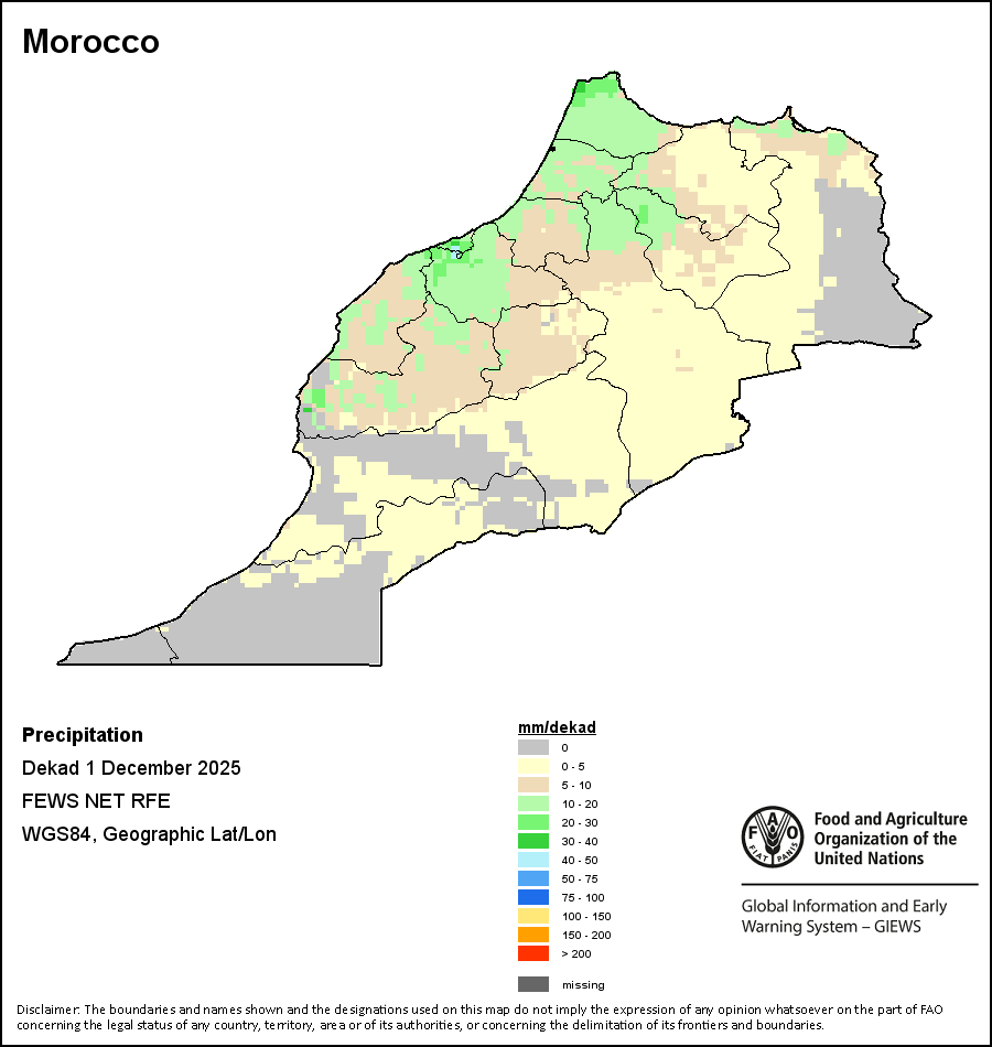The map depicts cumulative rainfall volumes over a dekad (a 10-day period). Precipitation estimates for all African countries (except Cabo Verde and Mauritius) are taken from NOAA/FEWSNet, while for the remaining countries data is obtained from ECMWF.