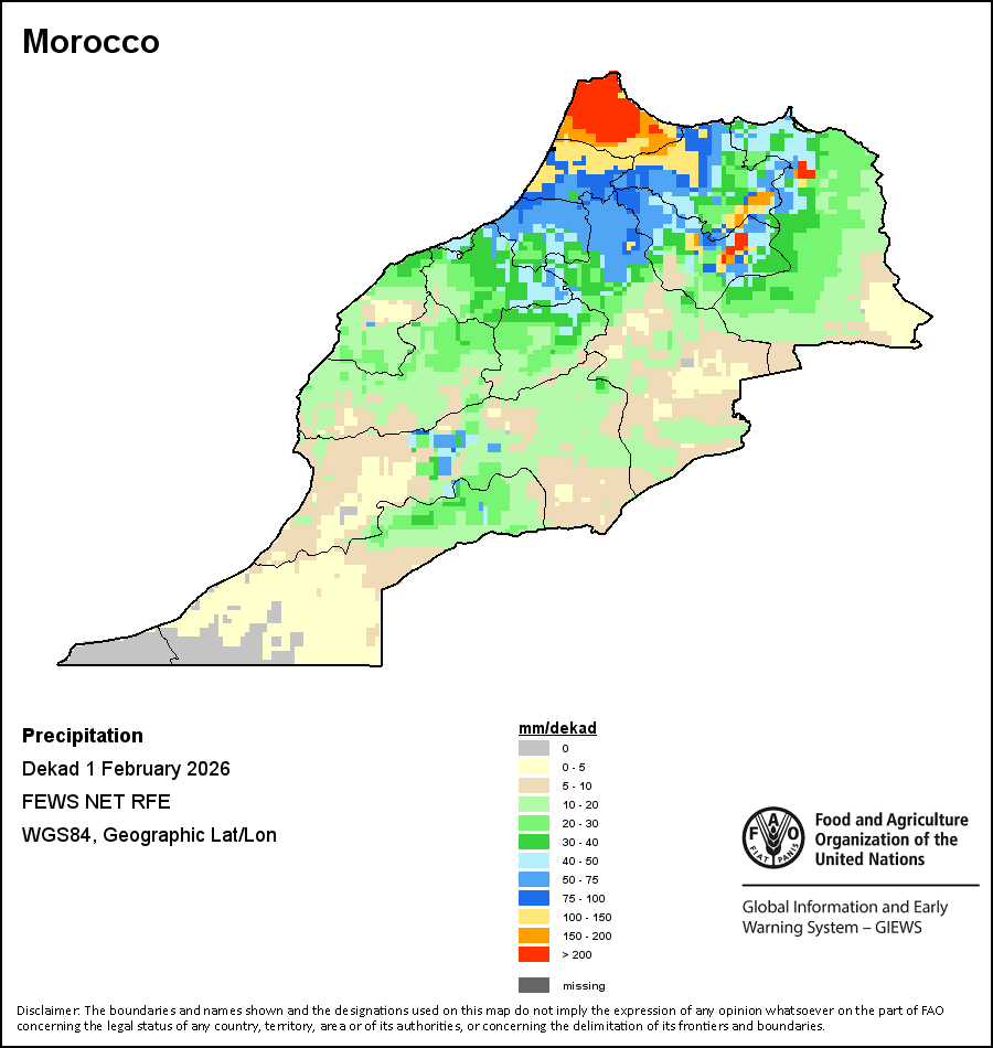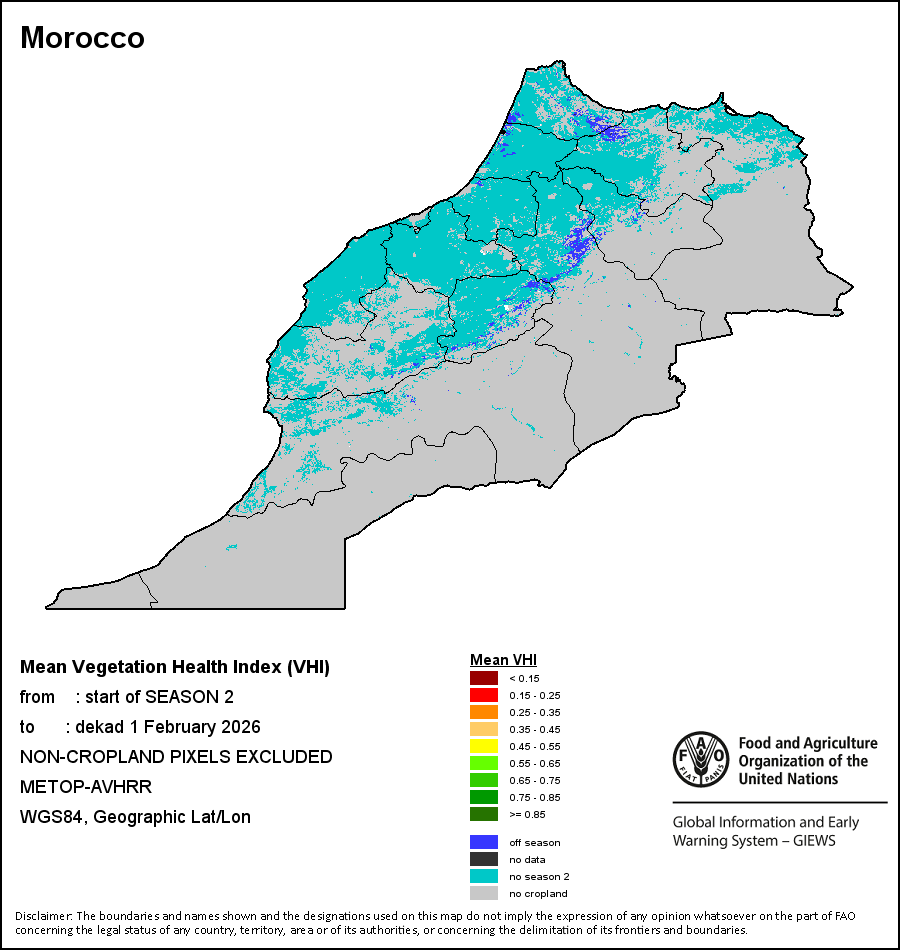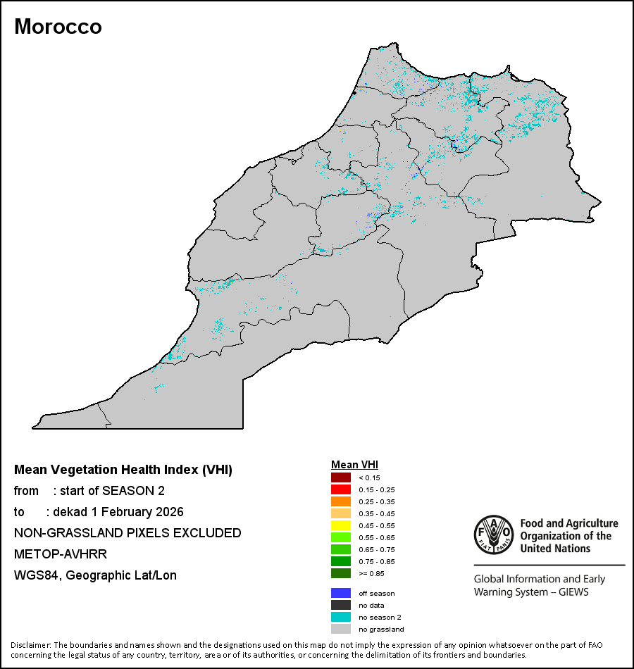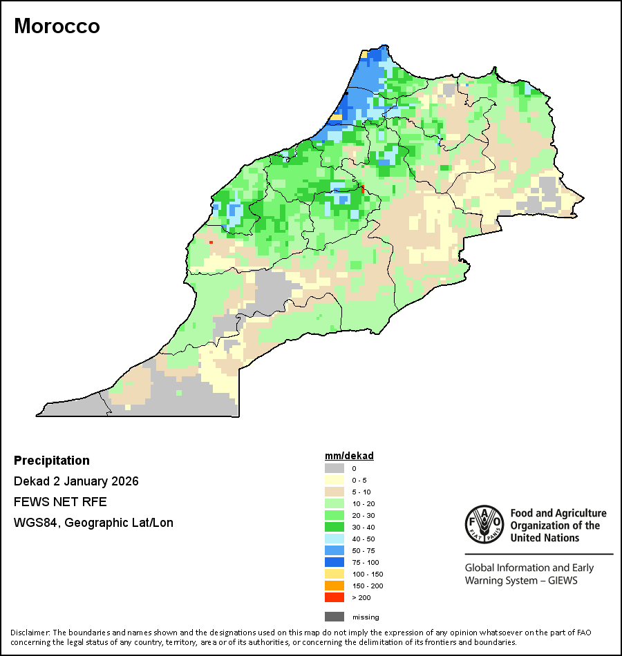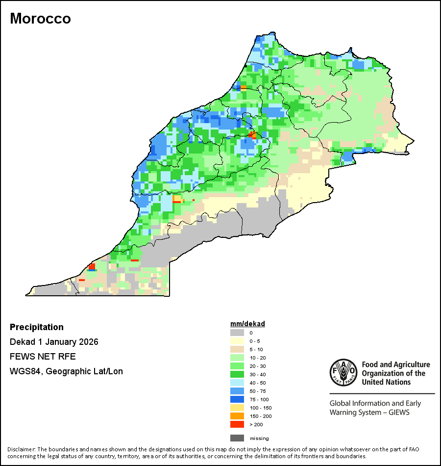 На картах и графиках на уровне страны показывается последний период в 36 месяцев по сезонным показателям, показателям растительного покрова и уровня атмосферных осадков. Данные представляются по 10-дневным периодам и по месяцам. Все три показателя растительного покрова основаны на 10-дневных данных по растительному покрову, полученных от сенсора METOR-AVHRR при разрешении в 1 км (начиная с 2007 года). Данные при разрешении в 1 км за период 1984-2006 гг. были получены из банка данных NOAA-AVHRR при разрешении в 16 км. Оценки атмосферных осадков для всех африканских стран (за исключением Кабо-Верде и Маврикия) получены из системы NOAA/Системы раннего предупреждения об опасности голода (разрешении в 16 km), а по остальным странам данные получены из системы ECMWF (разрешении в 25 km). Благодаря более высокой разрешающей способности показателей состояния растительного покрова (например, NDVI, VHI) по сравнению с показателями осадков, у некоторых стран количество субнациональных единиц, для которых можно получить действительную статистику по данным показателям, больше, чем по показателям осадков.