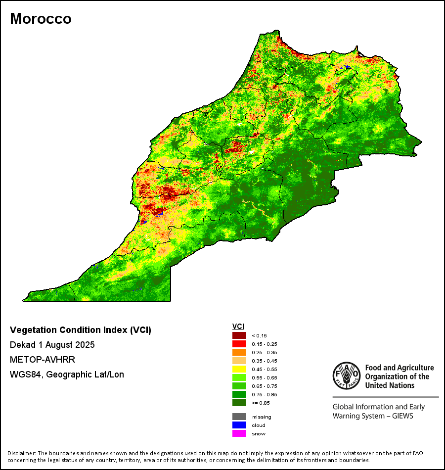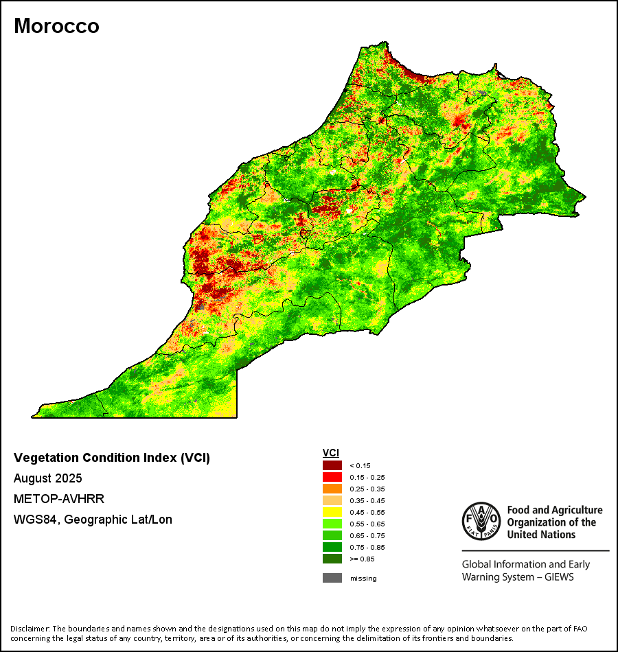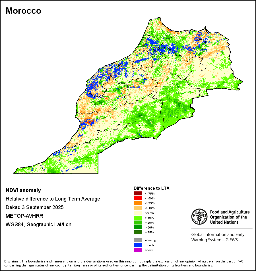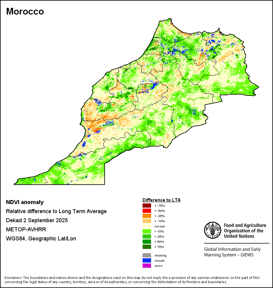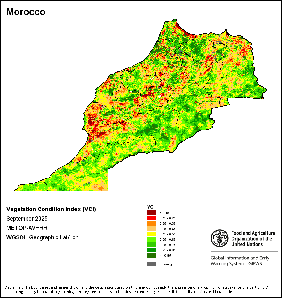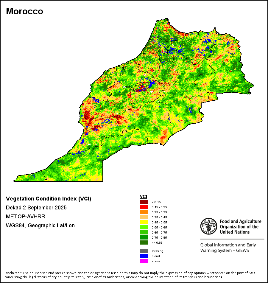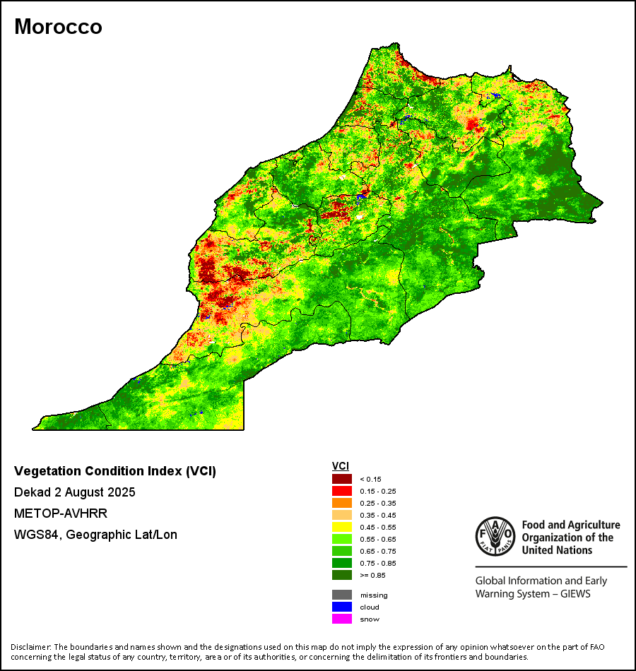 所有三项植被指标都是基于来自METOP-AVHRR遥感卫星分辨率1千米的10天(旬)植被数据(2007年及以后)得出的。1984-2006年期间的1千米分辨率数据得自NOAA-AVHRR16千米分辨率数据集。所有非洲国家的降水量估算(除佛得角和毛里求斯外)均取自NOAA/FEWSNet,其他国家则取自ECMWF。