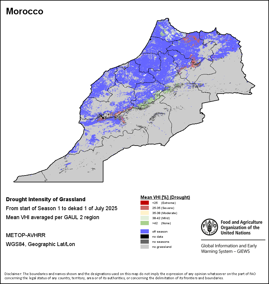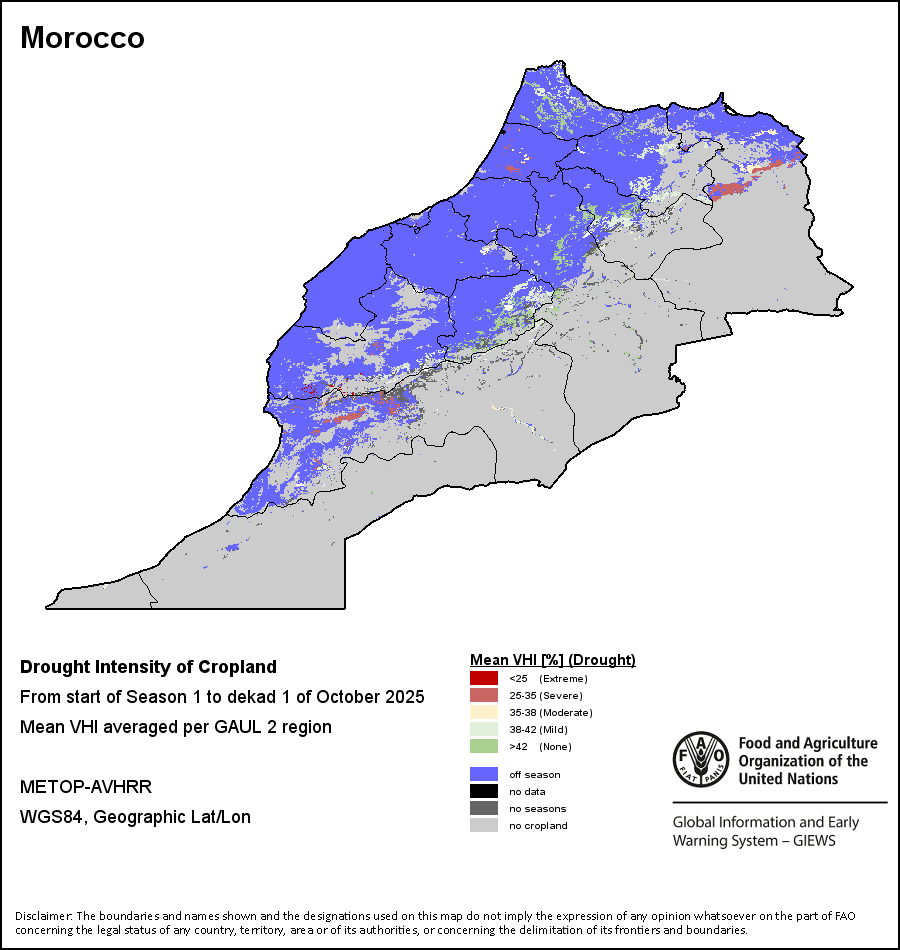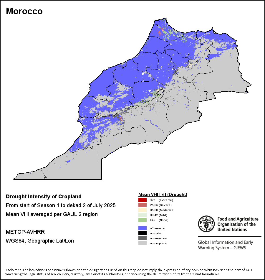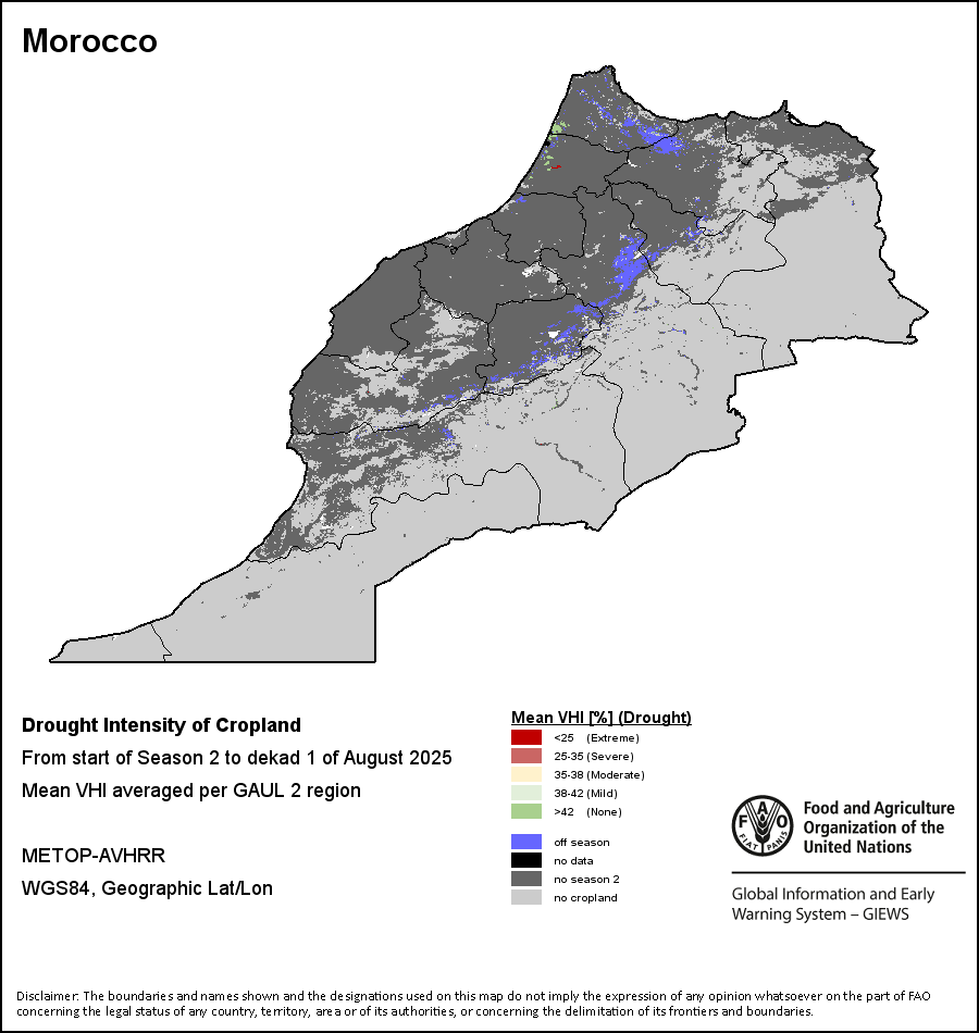 农业干旱依据其强度划分为四类:极端、严重、重度或轻度。干旱的强度通过各全球行政单位分层制度二级区域(GAUL 2)地区累积加权平均植被健康指数计算得出,意味着植被健康状况越差旱情就越严重。