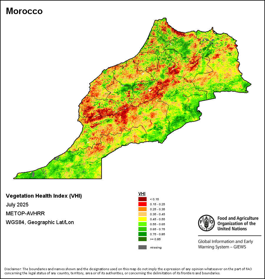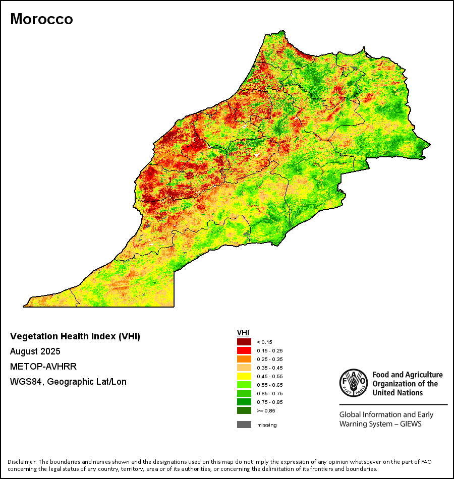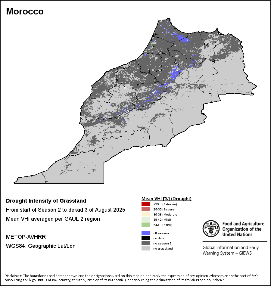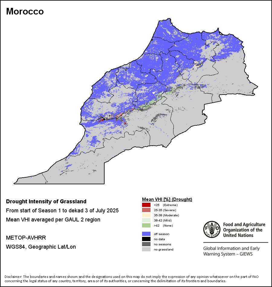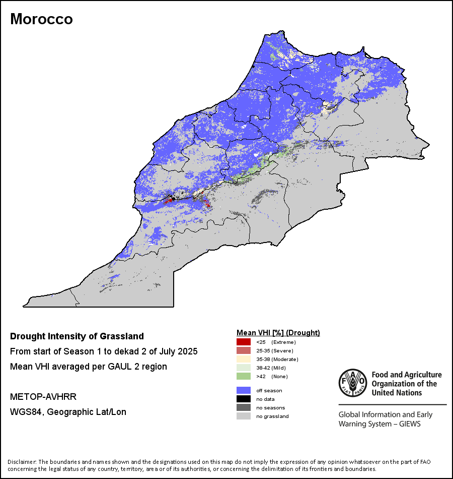 农业干旱依据其强度划分为四类:极端、严重、重度或轻度。干旱的强度通过各全球行政单位分层制度二级区域(GAUL 2)地区累积加权平均植被健康指数计算得出,意味着植被健康状况越差旱情就越严重。