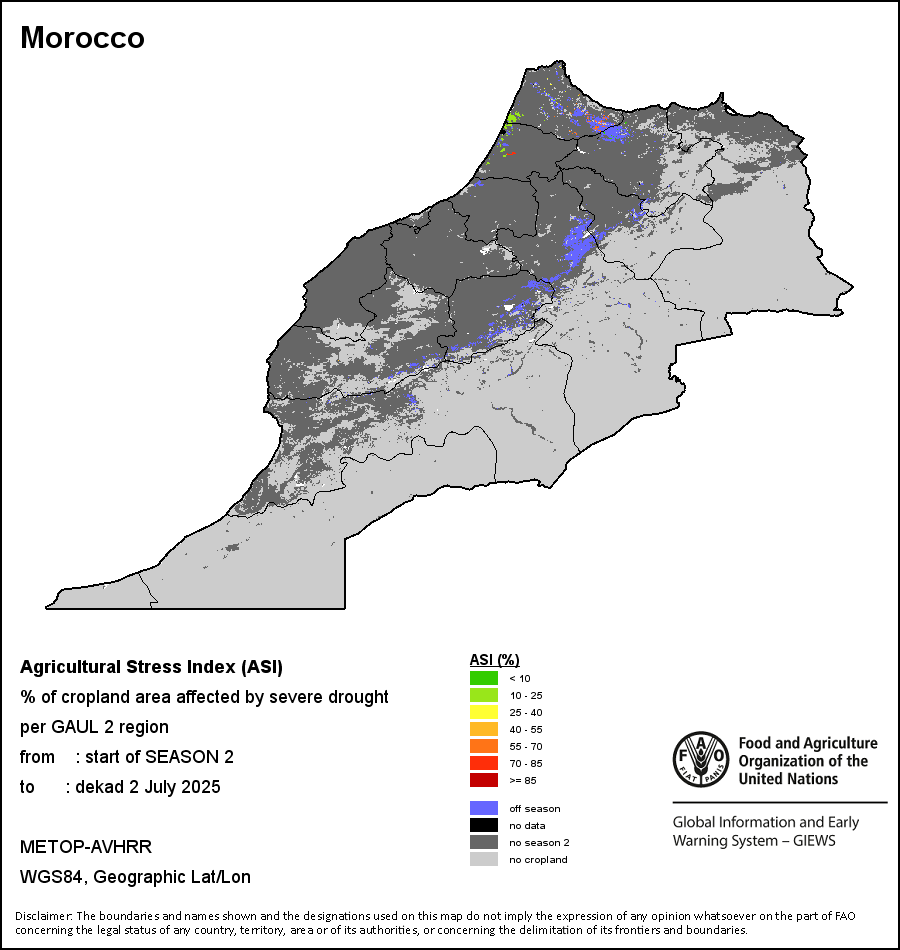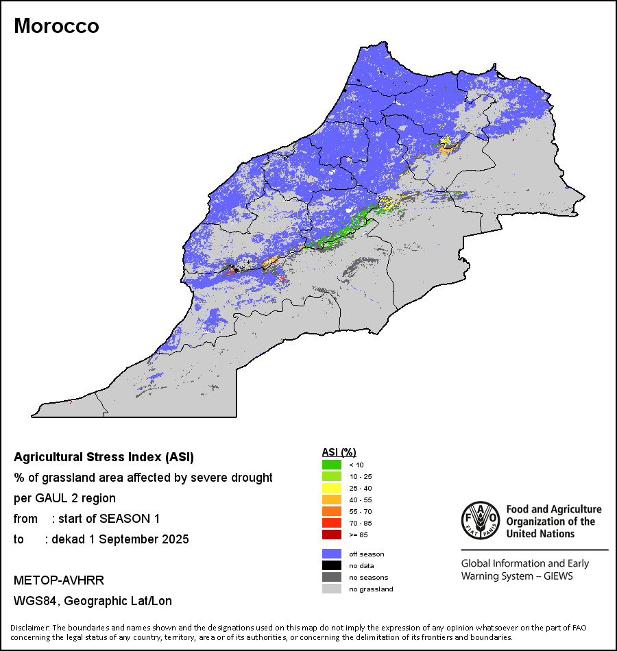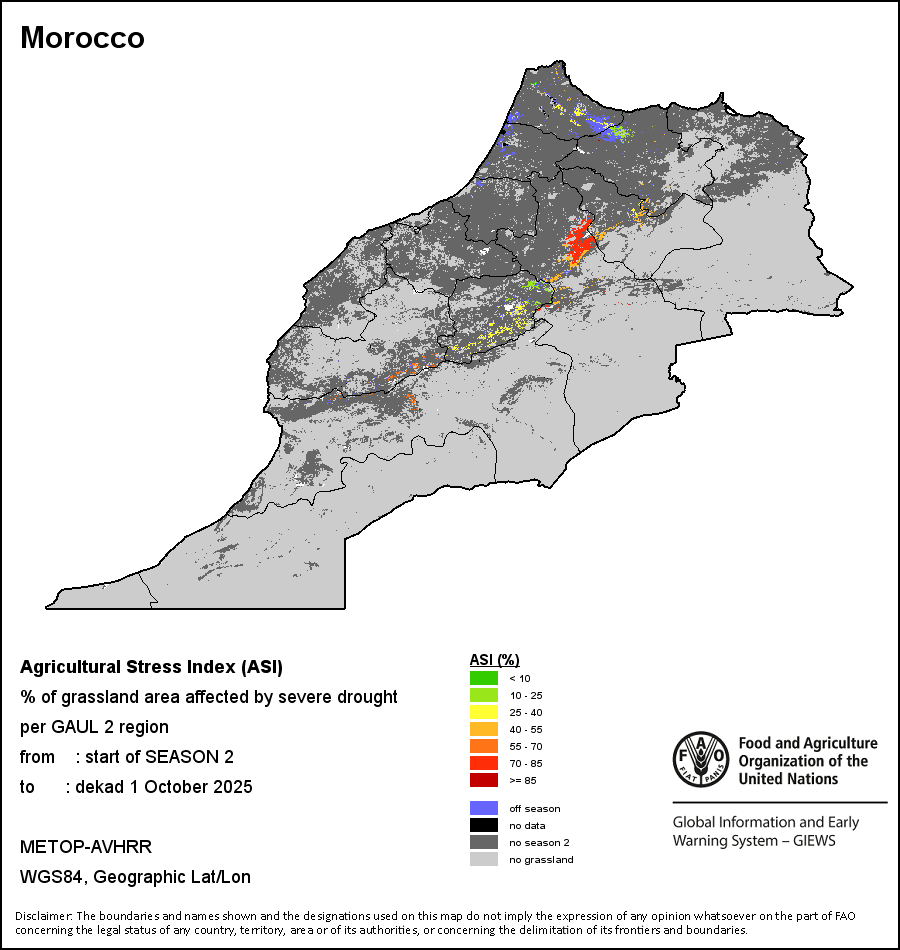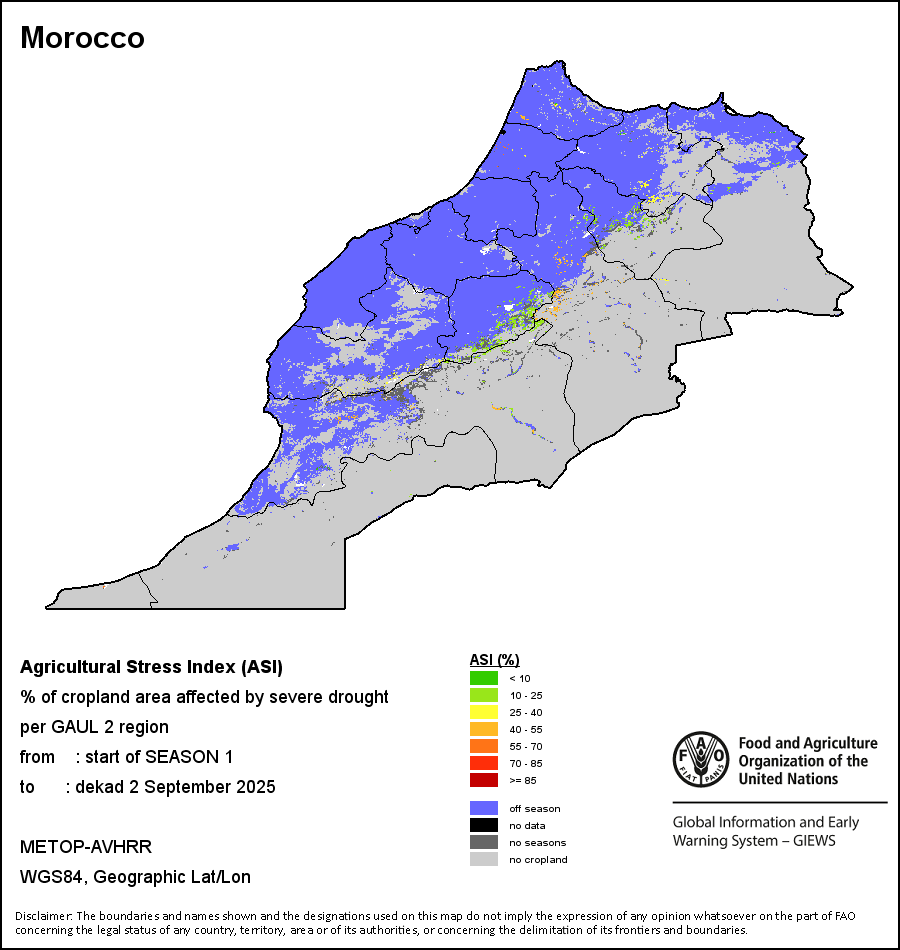 农业干旱胁迫指数(ASI)是一项速览指数,有助于在早期甄别较大可能发生水胁迫(干旱)的耕地。 该指数通过整合植被健康指数(VHI)在评估农业旱情方面具有关键意义的两个维度,即时间和空间维度,而得出。计算农业干旱胁迫指数的第一步是求植被健康指数的时间平均值,对作物周期内旱情的强度和时长进行像素级评估;这项计算包括采用作物系数衡量某种作物在各物候阶段对干旱胁迫的敏感度。第二步是确定旱情的空间广度,方法是计算植被健康指数值低于35%(Kogan前期研究将这一数值确定为评估干旱程度的临界值,1995年)的耕地的像素百分比。然后把各个行政区域根据受影响面积的百分比进行划分,便于对结果进行快速解读。