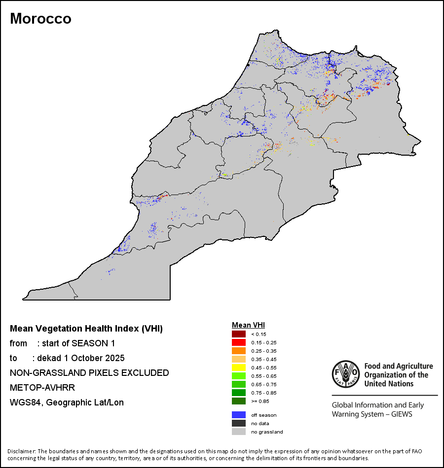 国别地图和图表显示的是最近36个月期间的季节、植被和降水指标。数据按每10天和每月呈现。   更多