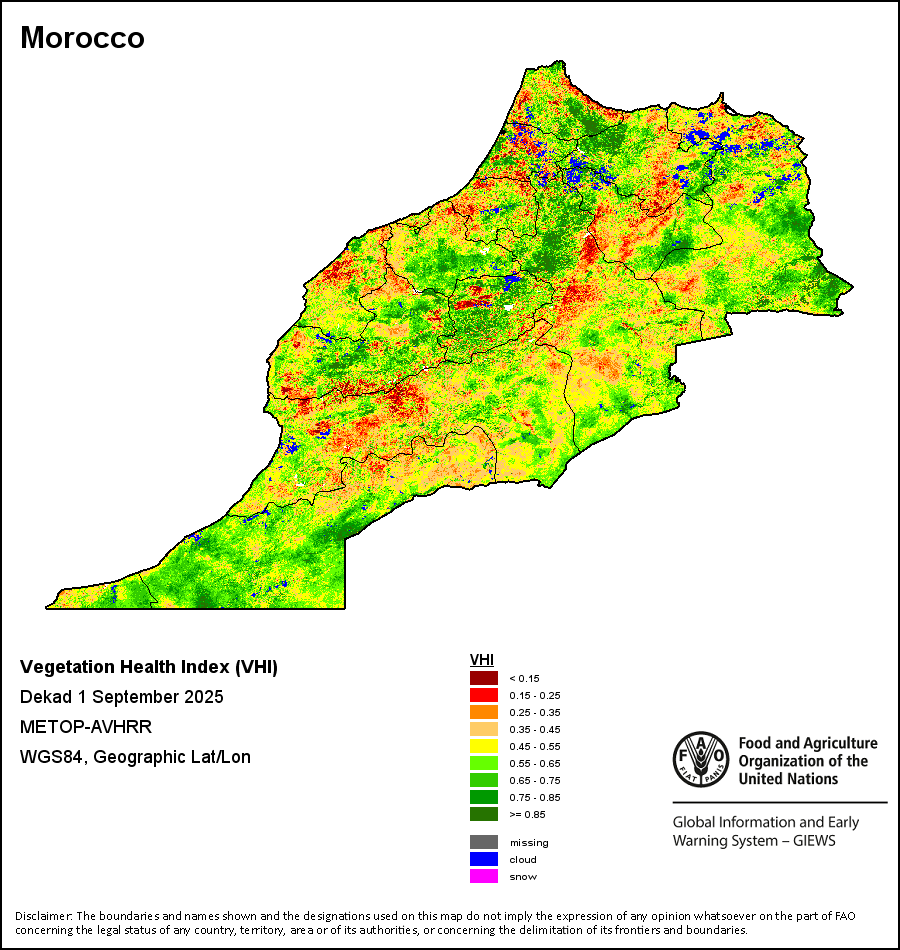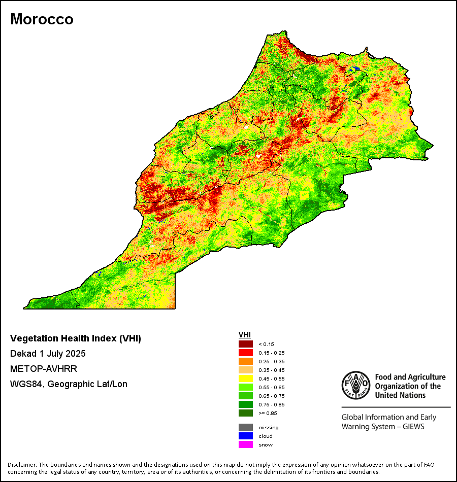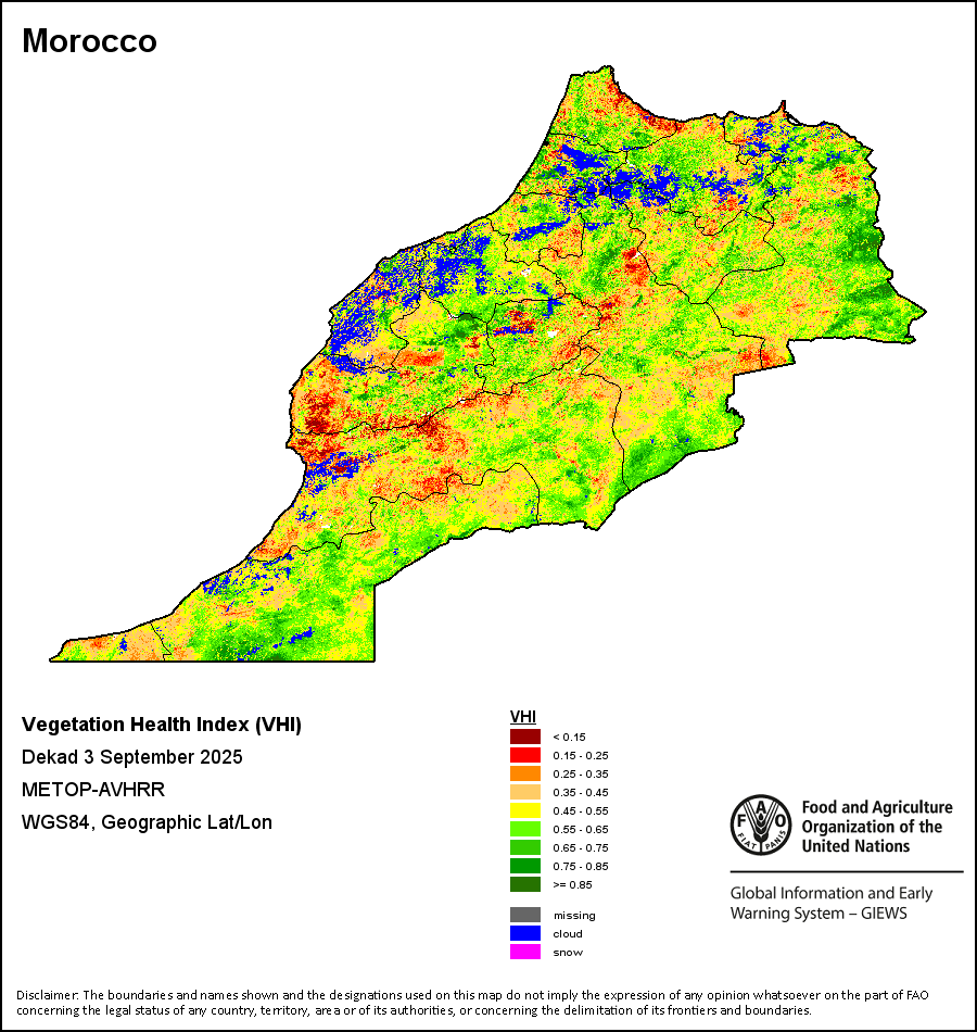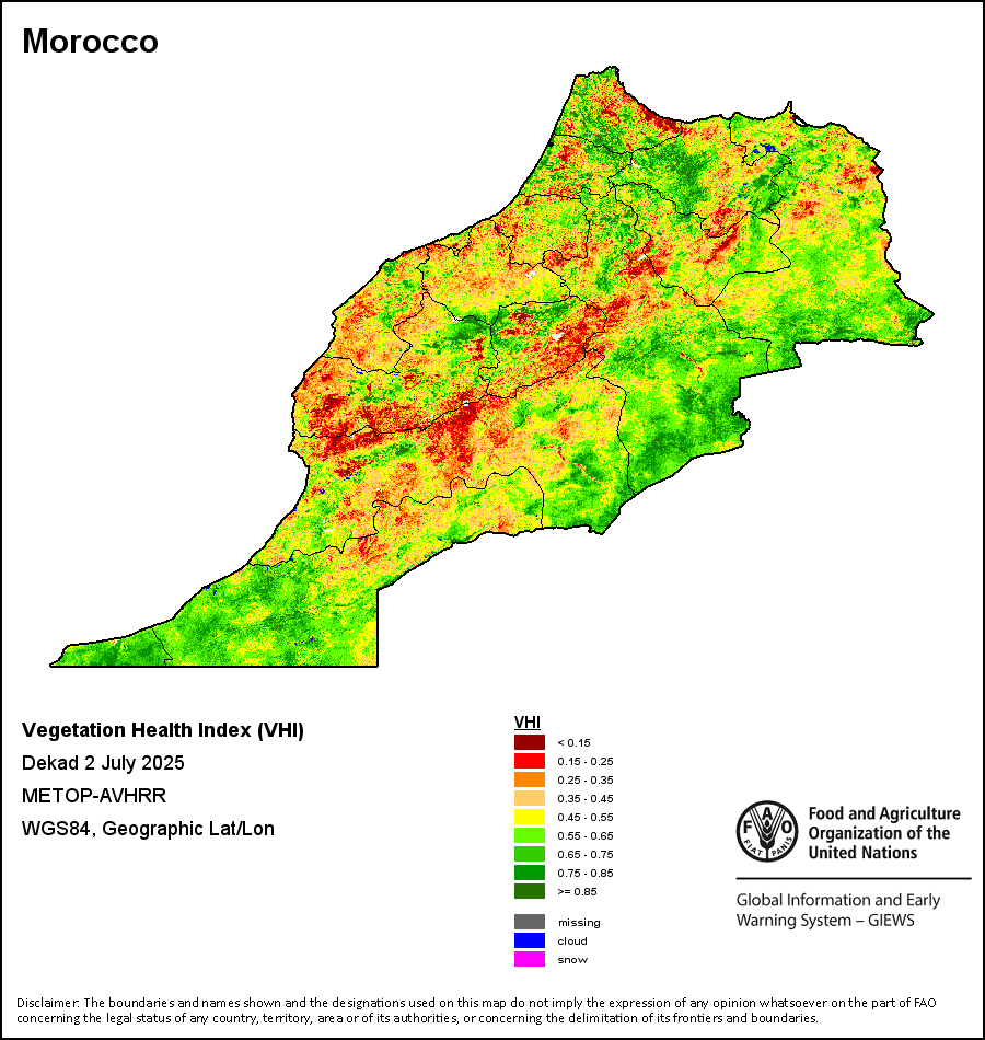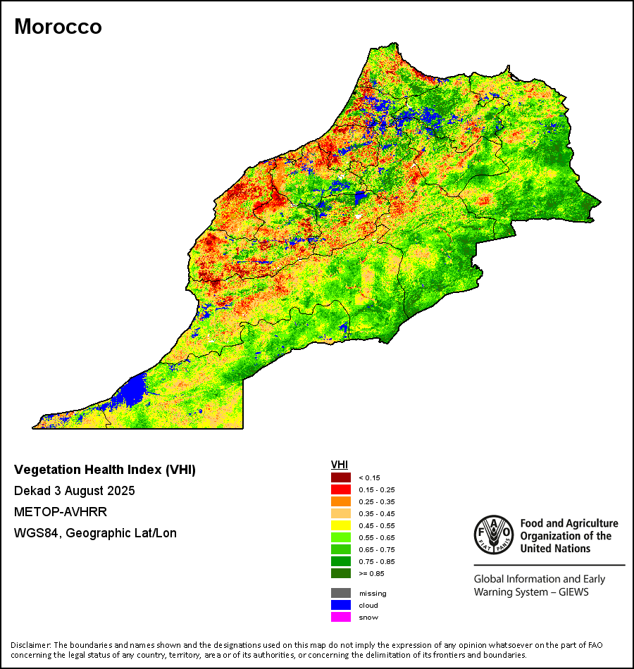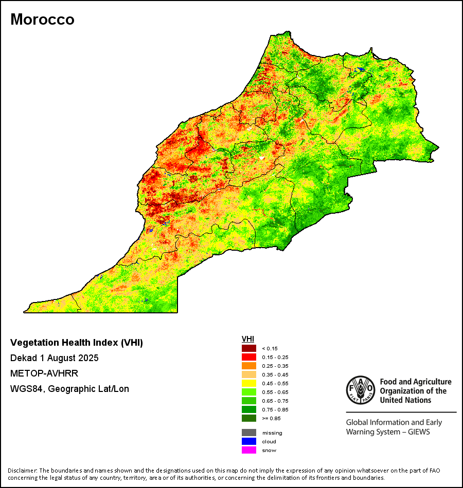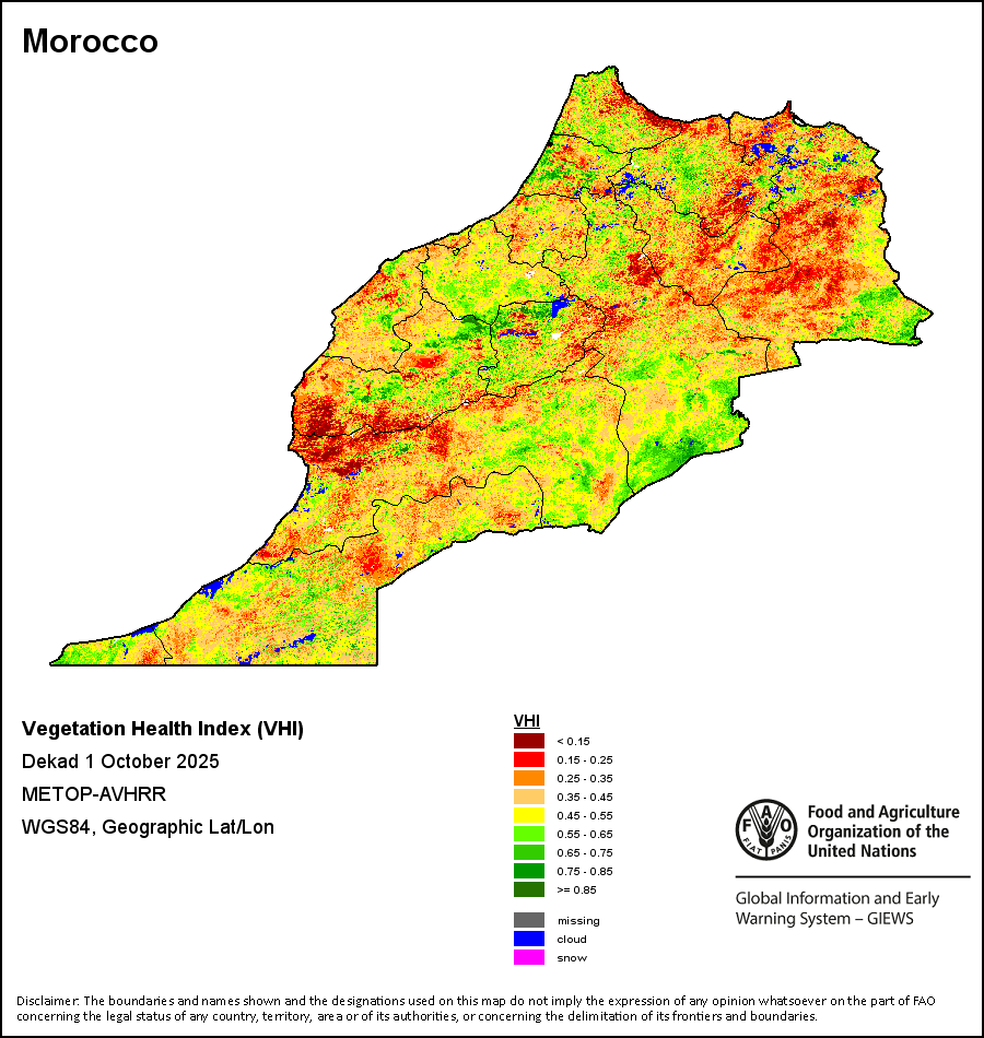 植被健康指数(VHI)根据植被健康状况以及气温对作物状况的影响情况显示干旱的严重程度。 VHI是一项综合指数,是用于计算ASI的基础性指标。它结合了植被状况指数(VCI)和气温状况指数(TCI)。TCI的计算采用了与VCI类似的方程,但它把当前气温与长期最高和最低值联系起来,因为一个假定前提是气温越高就倾向于造成植被状况恶化。比方说,VHI指数下降就意味着植被状况相对较差,而气温越高则意味着植被状况受到胁迫,较长时间延续则成为干旱的指征。VHI映像针对两个主要季节进行计算并分为三种时间模式:旬度、月度和年度。