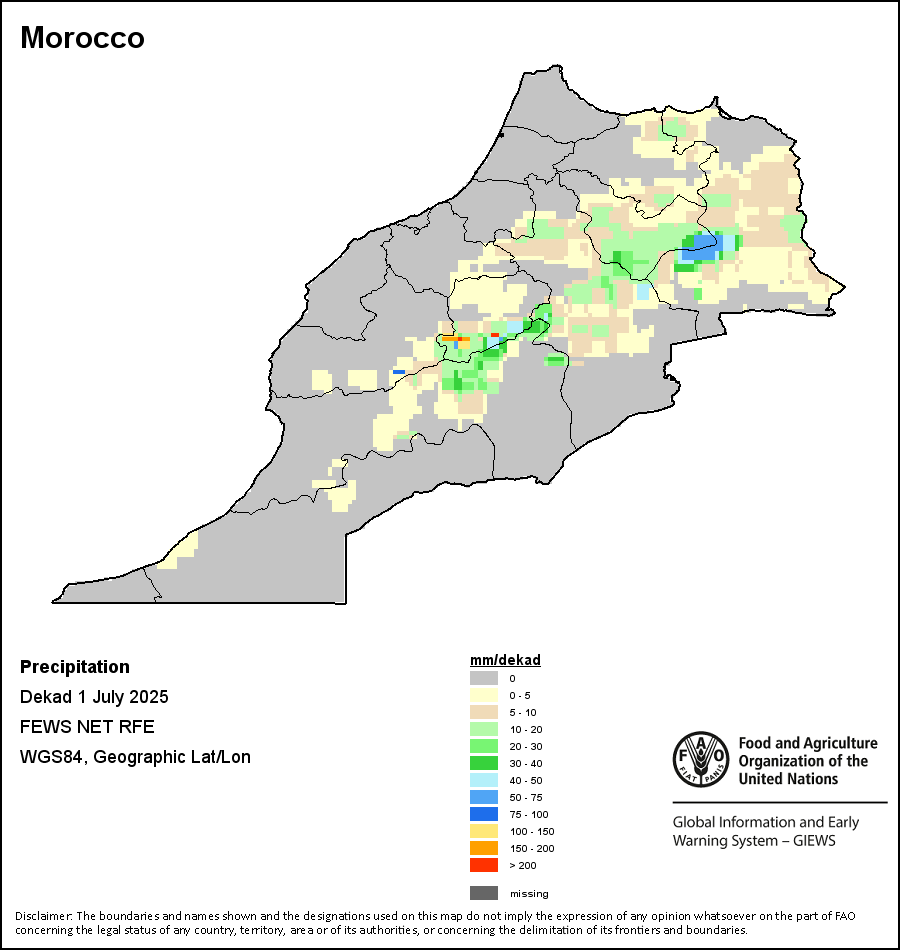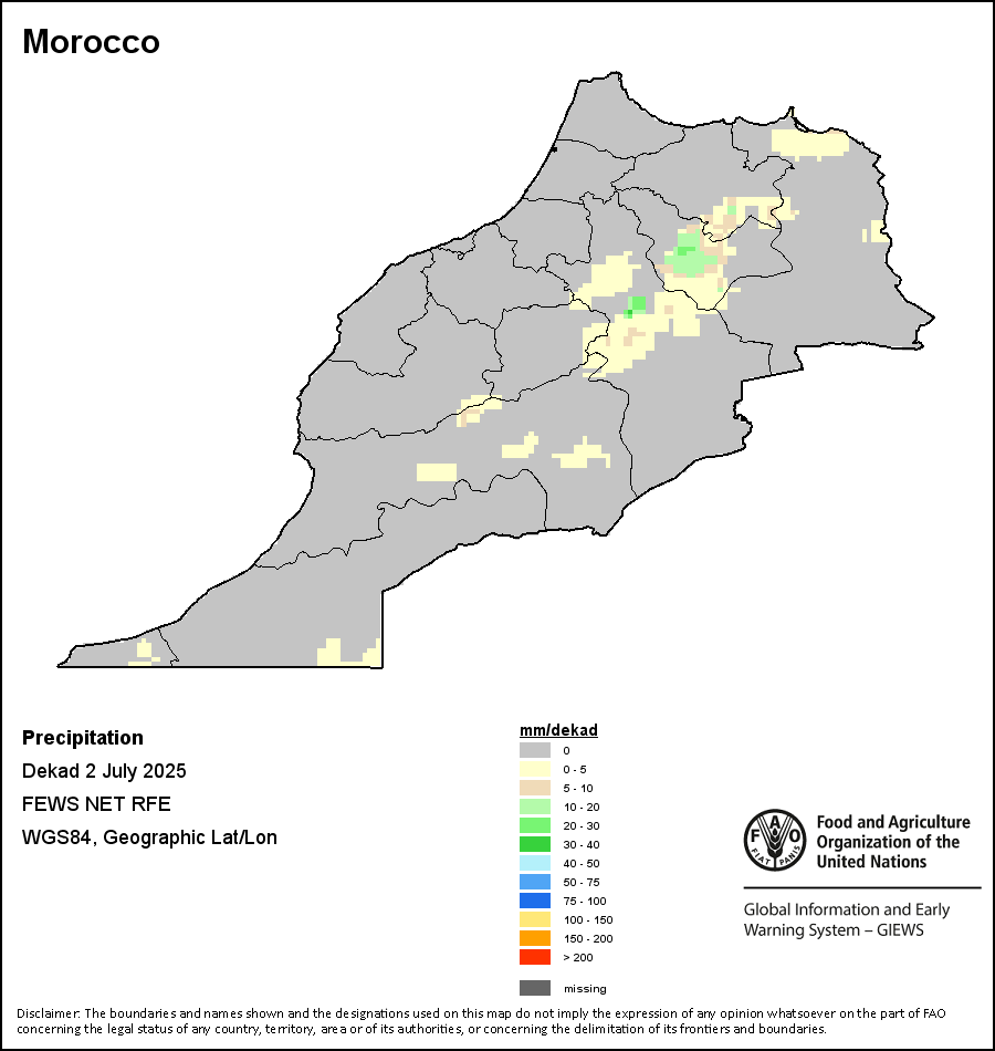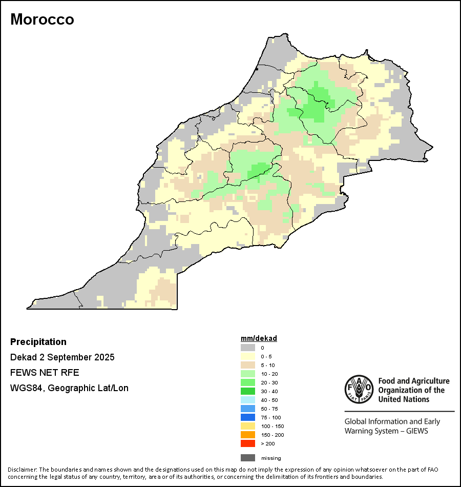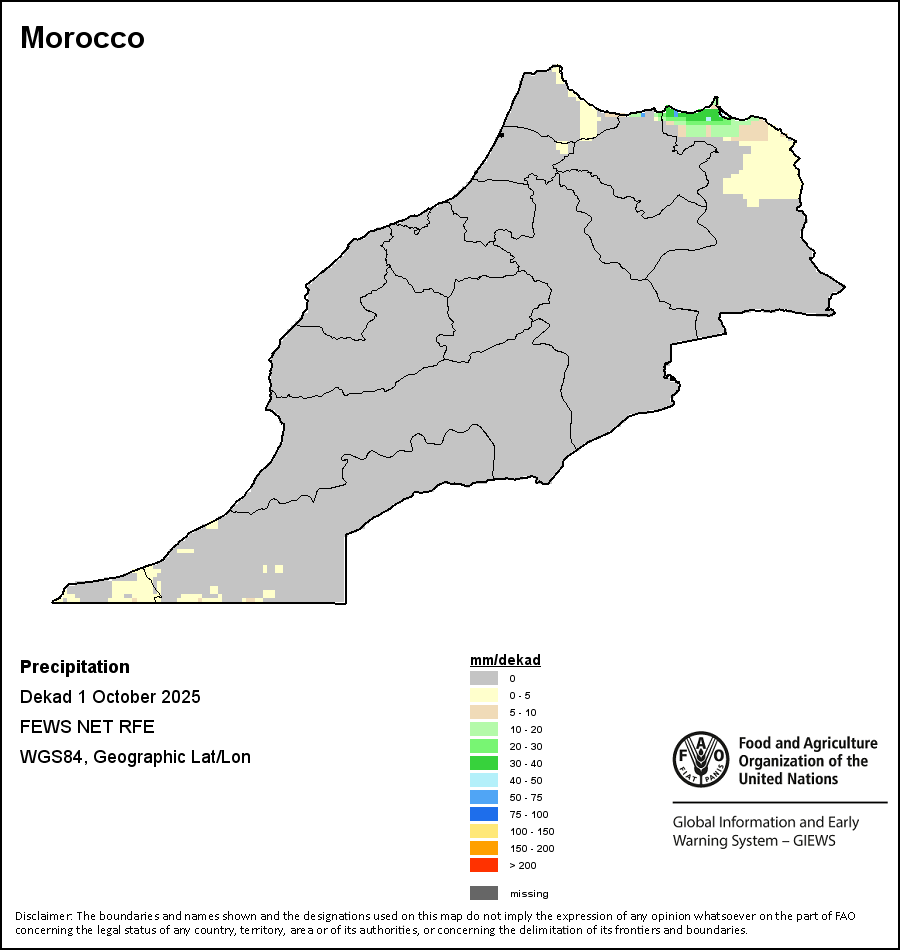 该图谱显示了每一旬(十天)的累积降水量。 所有非洲国家的降水量估算(除佛得角和毛里求斯外)均取自NOAA/FEWSNet,其他国家则取自ECMWF。