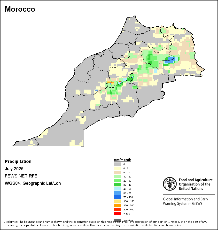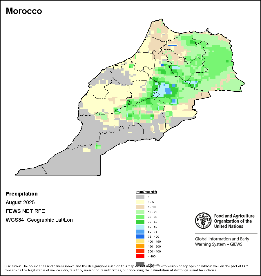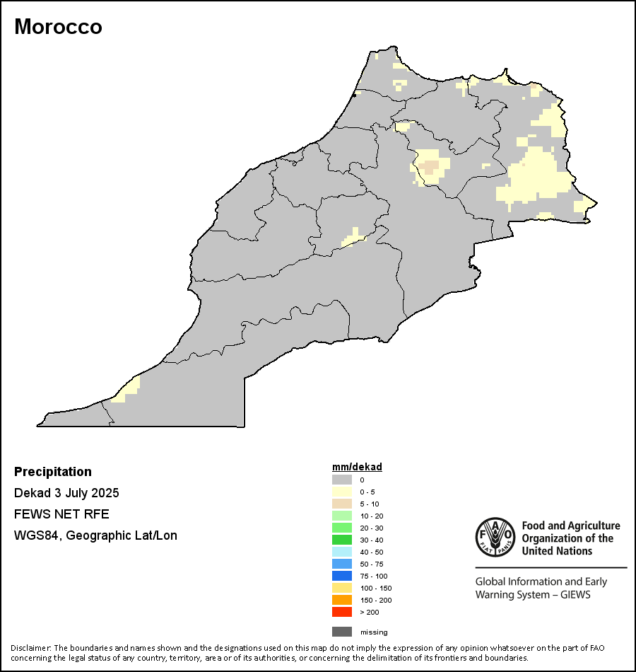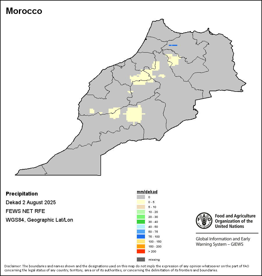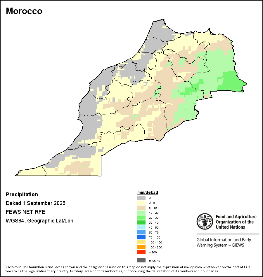 该图谱显示了每一旬(十天)的累积降水量。 所有非洲国家的降水量估算(除佛得角和毛里求斯外)均取自NOAA/FEWSNet,其他国家则取自ECMWF。