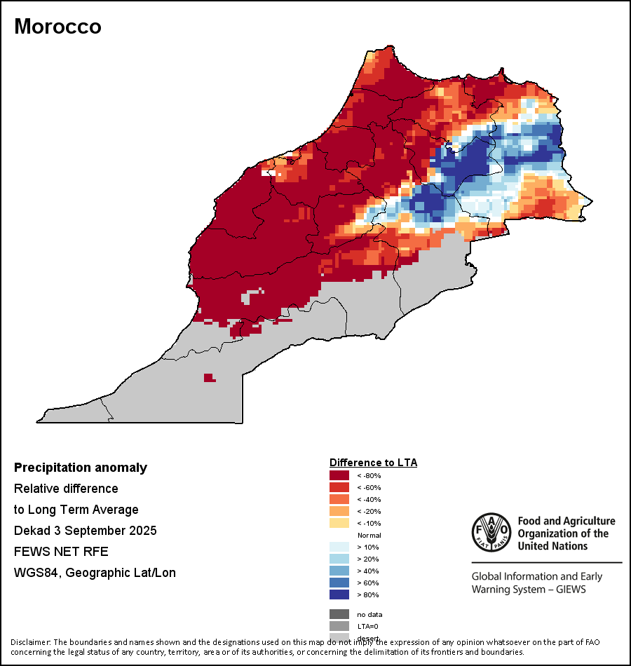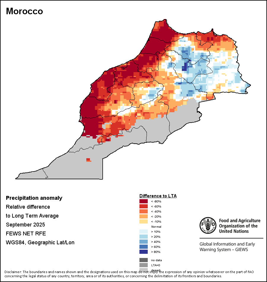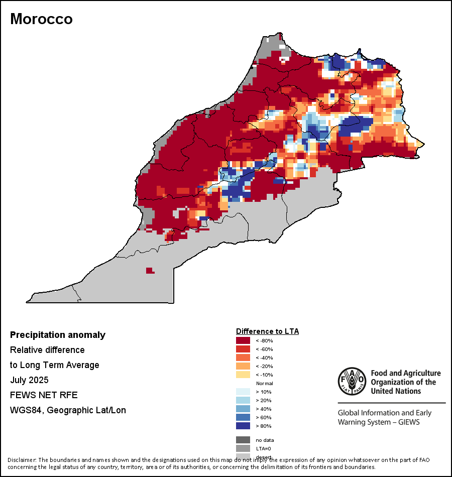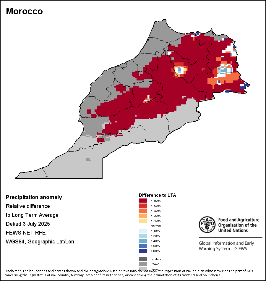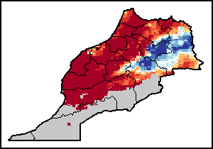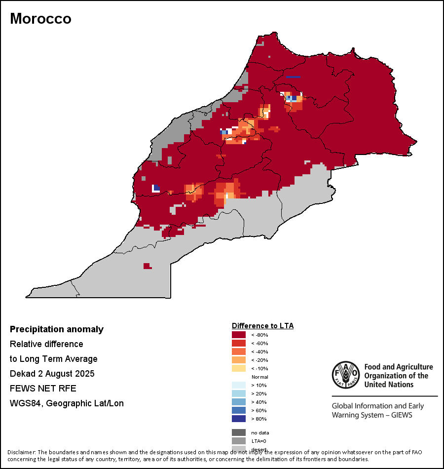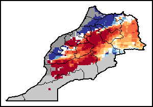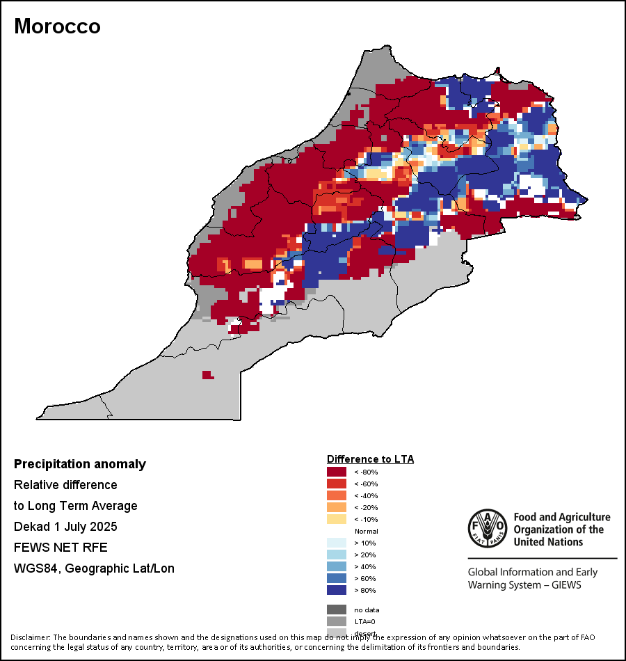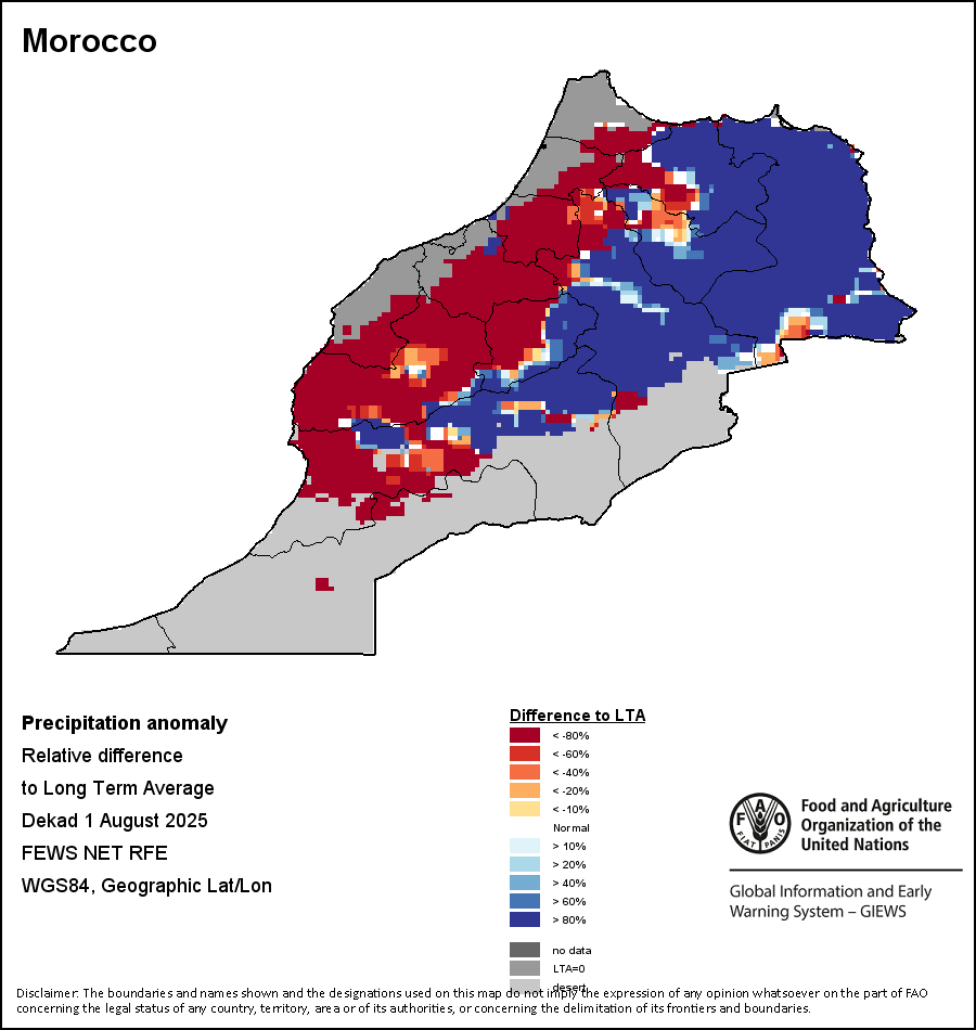 该图谱显示了当前降水量与平均水平之间的差异。 由降水量水平与长期平均值(LTA)进行比较得出,长期平均值系指1989-2015年期间的数值。暖色调指示的是降水量低于平均水平的地区,而冷色调指示的则是降水量高于平均水平的地区。降雨量估算数据来自欧洲中期天气预报这些(ECMWF)。