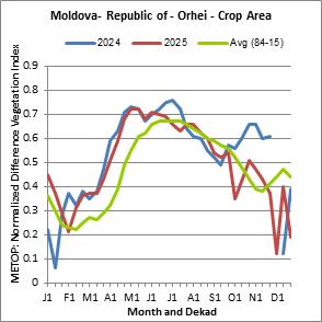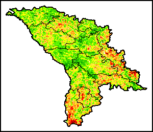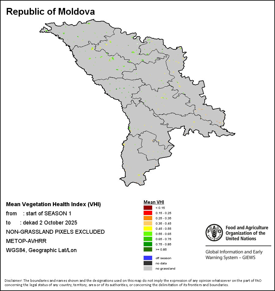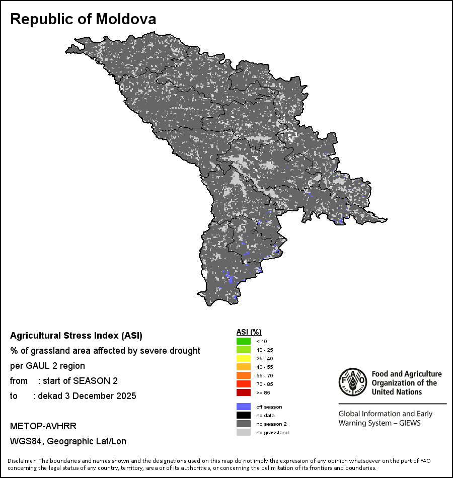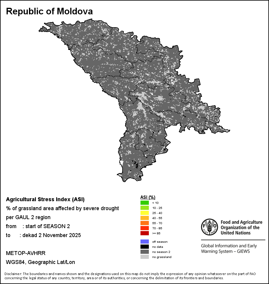 The Agricultural Stress Index (ASI) is a quick-look indicator that facilitates the early identification of cropped land with a high likelihood of water stress (drought). The Index is based on the integration of the Vegetation Health Index (VHI) in two dimensions that are critical in the assessment of a drought event in agriculture: temporal and spatial. The first step of the ASI calculation is a temporal averaging of the VHI, assessing the intensity and duration of dry periods occurring during the crop cycle at the pixel level; this calculation includes the use of crop coefficients, which introduces sensitivity of a crop to water stress during each phenological phase. The second step determines the spatial extent of drought events by calculating the percentage of pixels in arable areas with a VHI value below 35 percent (this value was identified as a critical threshold in assessing the extent of drought in previous research by Kogan, 1995). Each administrative area is classified according to the percentage of the affected area to facilitate the quick interpretation of results.