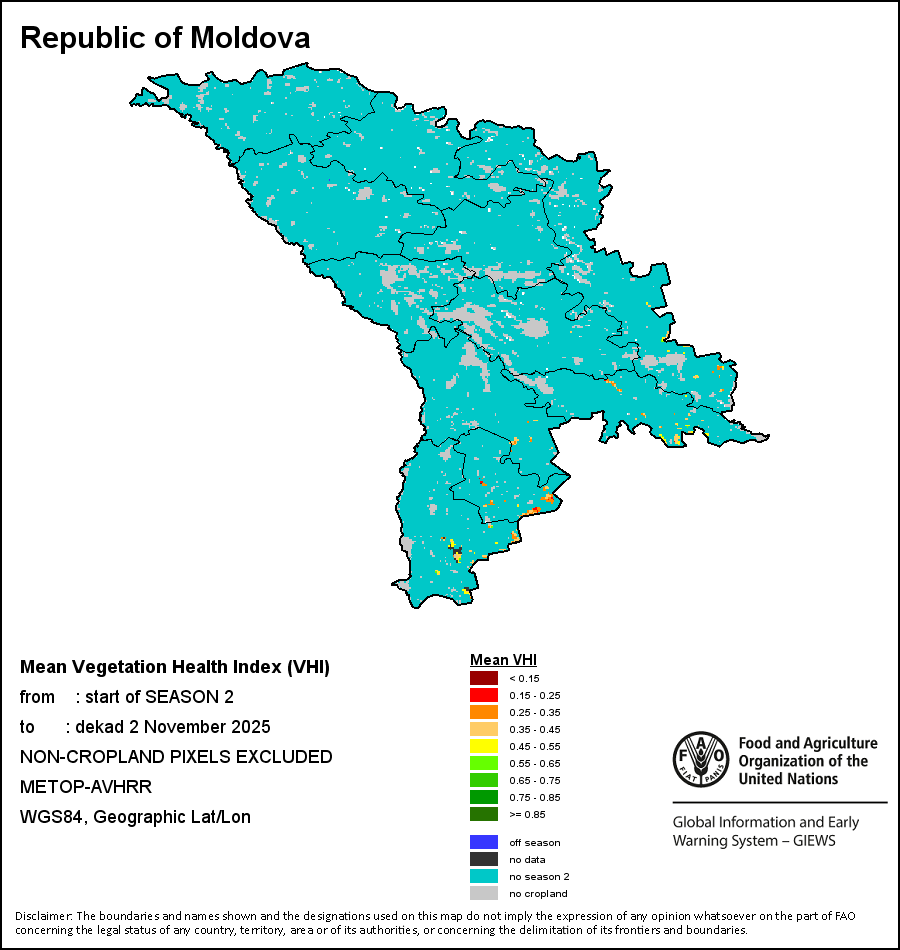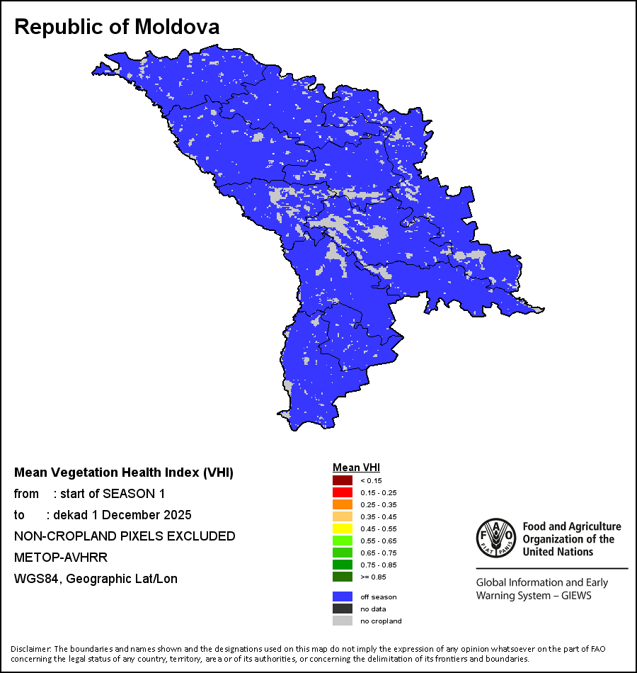 The Weighted Mean Vegetation Health Index (Weighted Mean VHI) allows the user to assess the severity of the drought from the start of the growing season, examining the vegetation health and the influence of temperature on plant conditions. The Mean VHI is an average of the dekadal VHI values over the crop growing season (from the start until the last dekad of analysis), weighted by crop coefficients (Kc), assigned to VHI values at the dekads corresponding to the Start of the Season (SOS), Maximum of the Season (MOS) and End of the Season (EOS). Crop coefficient is applied for the purpose of reflecting the crop’s water sensitivity at different phenology stages.