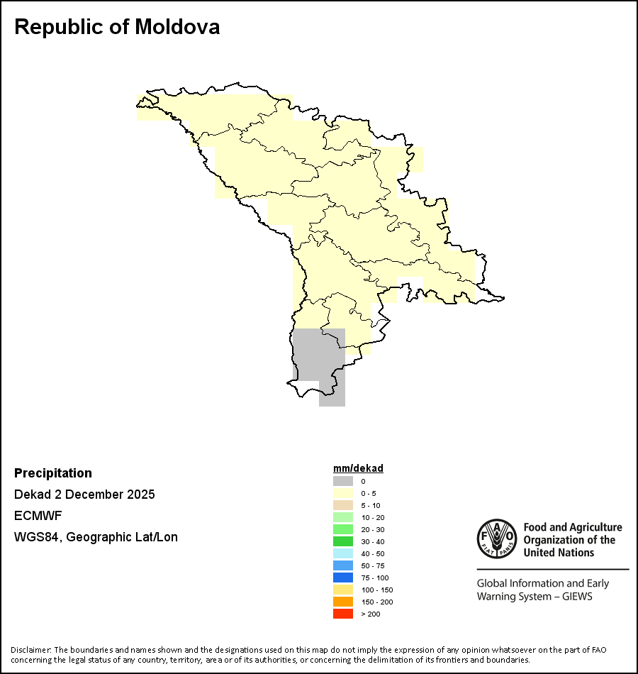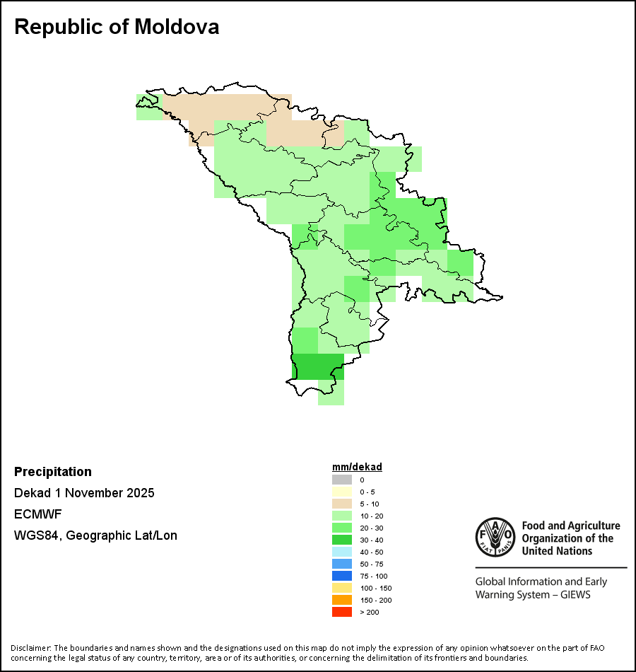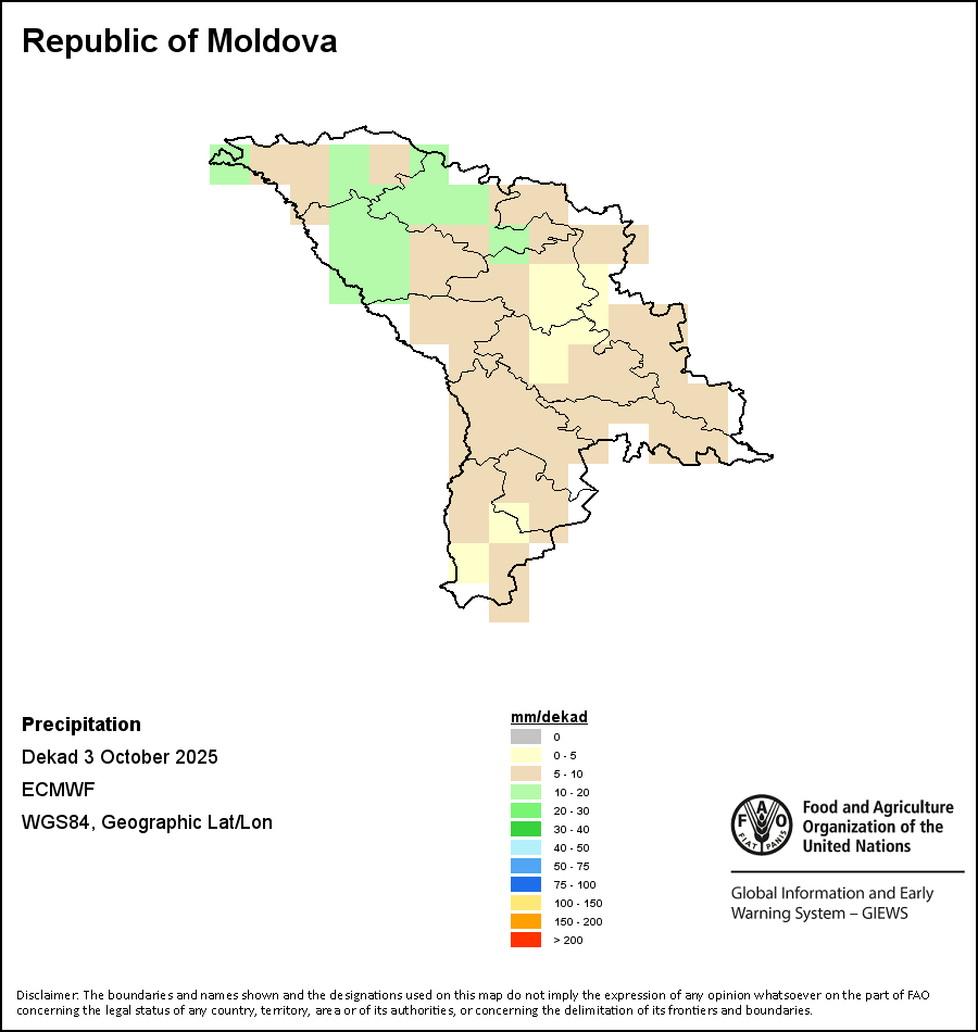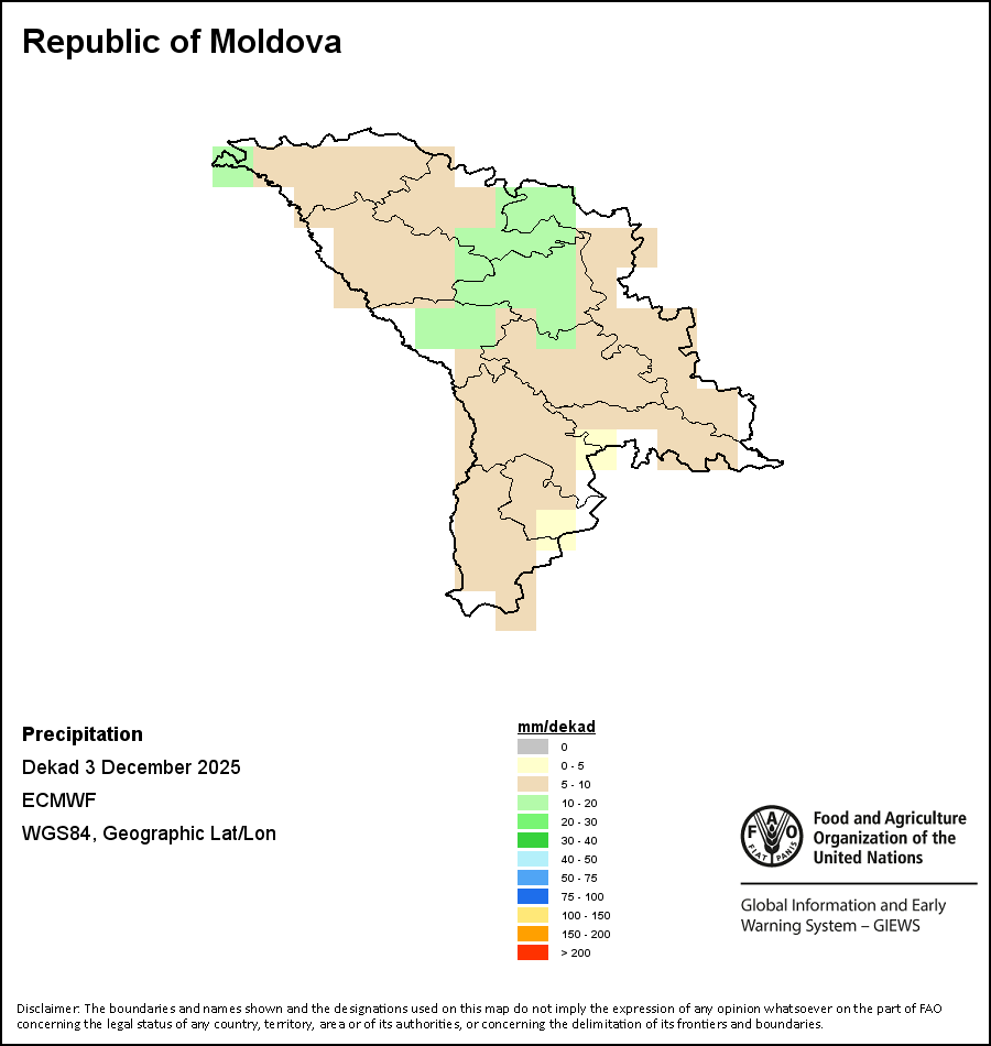 The map depicts cumulative rainfall volumes over a dekad (a 10-day period). Precipitation estimates for all African countries (except Cabo Verde and Mauritius) are taken from NOAA/FEWSNet, while for the remaining countries data is obtained from ECMWF.
