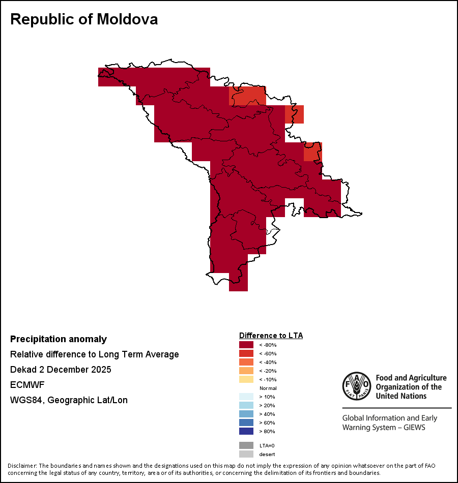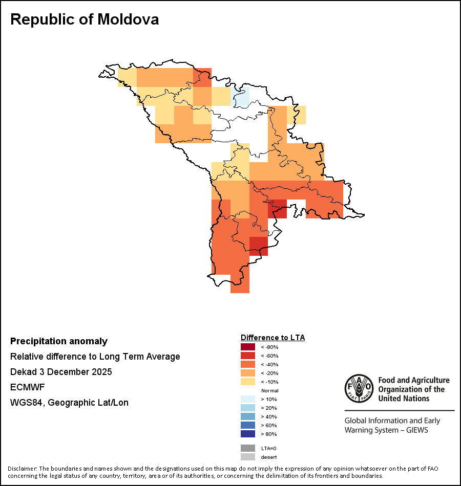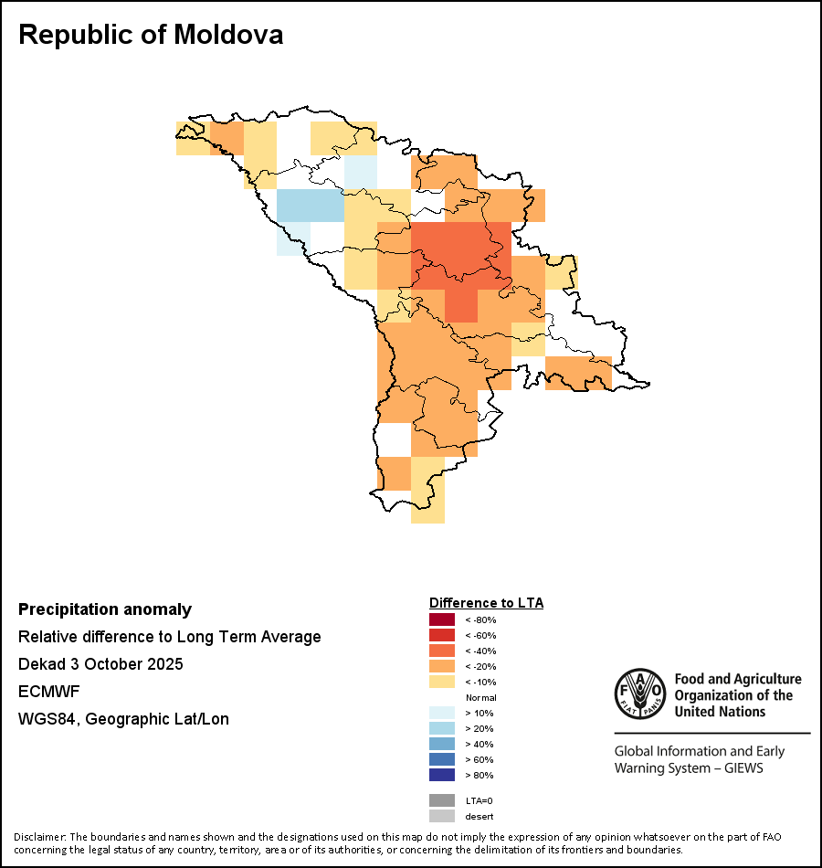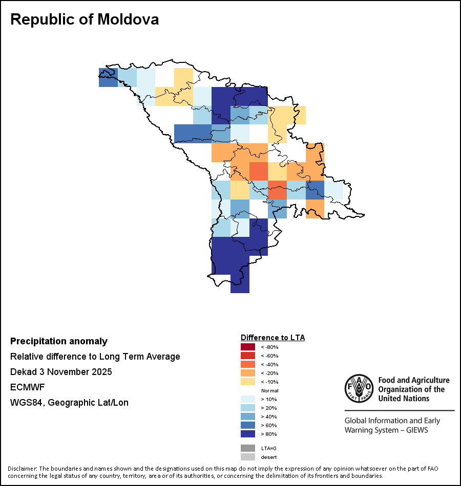 The map illustrates the difference between the current rainfall volume and the average level. Rainfall levels are compared with the Long-Term Average (LTA), which refers to the period 1989-2015. Warmer colours identify areas which have received lower-than-average rainfall, while colder colours are given to areas where precipitation has been above average.