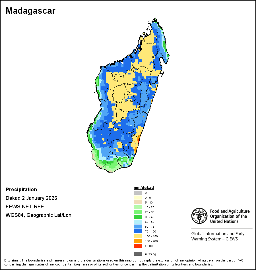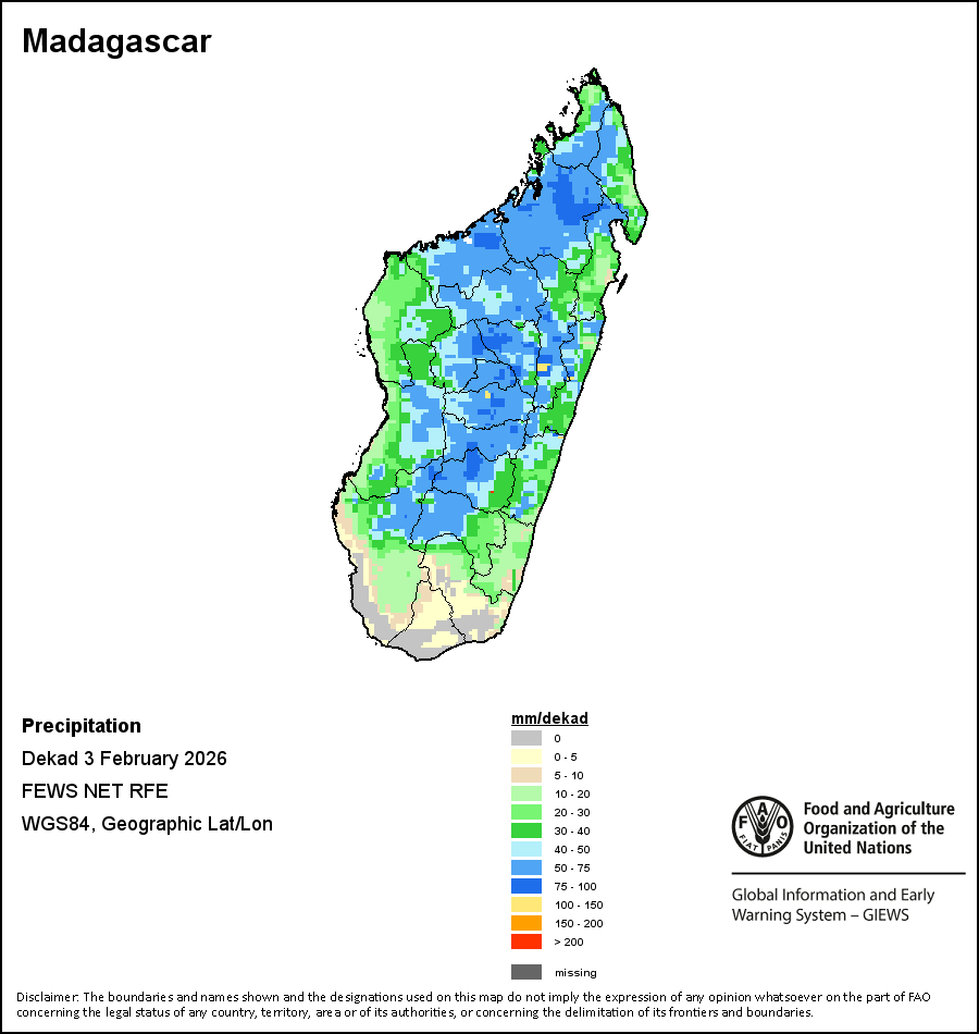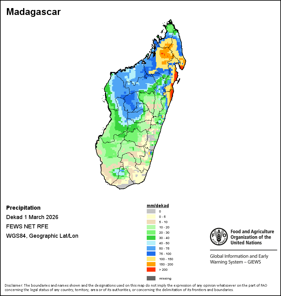 La carte illustre les volumes cumulés de précipitations au cours d’une décade (une période de 10 jours). Les estimations concernant les précipitations pour tous les pays africains (à l'exception du Cap Vert et de Maurice) proviennent du NOAA/FEWSNet, tandis que les données concernant les autres pays sont obtenues à partir du CEPMMT.