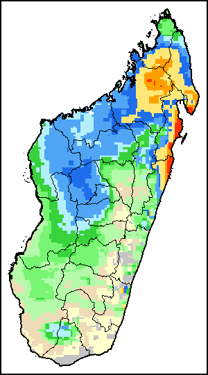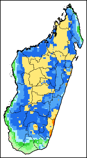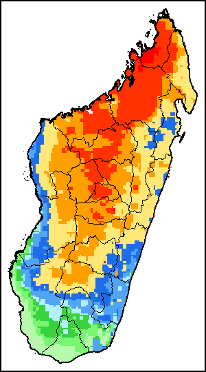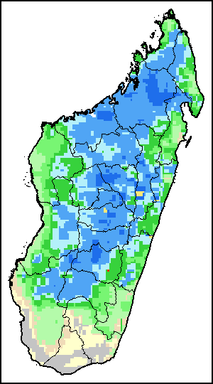 Les cartes et les graphiques au niveau des pays illustrent les indicateurs d’avancement de la campagne, de végétation et de pluviométrie au cours des 36 derniers mois. Les données sont présentées par décade et par mois. Les trois indicateurs de végétation sont basés sur les données relatives à la végétation pour 10 jours (décade) du capteur Metop-AVHRR par pixel de 1 km (à partir de 2007). Les données à 1 km de résolution pour la période 1984-2006 ont été dérivées des données du NOAA-AVHRR à 16 km de résolution. - Les estimations concernant les précipitations pour tous les pays africains (à l'exception du Cap Vert et de Maurice) proviennent du NOAA/FEWSNet, tandis que les données concernant les autres pays sont obtenues à partir du CEPMMT. Compte tenu de la résolution plus élevée des indicateurs de végétation (ex. NDVI, VHI) par rapport à celle des indicateurs de précipitations, plus grossiers, le nombre d’unités infranationales pour lesquelles des statistiques zonales valides peuvent être produites à partir des indices de végétation est, dans certains pays, supérieur à celui obtenu à partir des indicateurs de précipitations.
