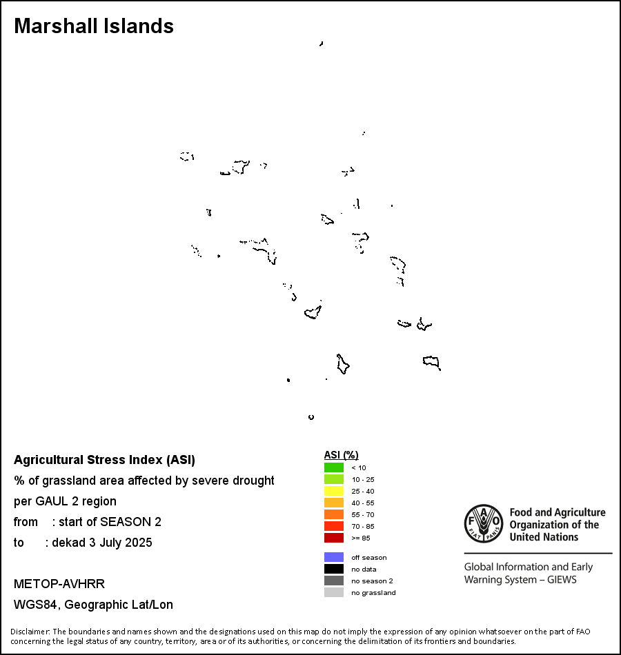 The Agricultural Stress Index (ASI) is a quick-look indicator that facilitates the early identification of cropped land with a high likelihood of water stress (drought). The Index is based on the integration of the Vegetation Health Index (VHI) in two dimensions that are critical in the assessment of a drought event in agriculture: temporal and spatial. The first step of the ASI calculation is a temporal averaging of the VHI, assessing the intensity and duration of dry periods occurring during the crop cycle at the pixel level; this calculation includes the use of crop coefficients, which introduces sensitivity of a crop to water stress during each phenological phase. The second step determines the spatial extent of drought events by calculating the percentage of pixels in arable areas with a VHI value below 35 percent (this value was identified as a critical threshold in assessing the extent of drought in previous research by Kogan, 1995). Each administrative area is classified according to the percentage of the affected area to facilitate the quick interpretation of results.