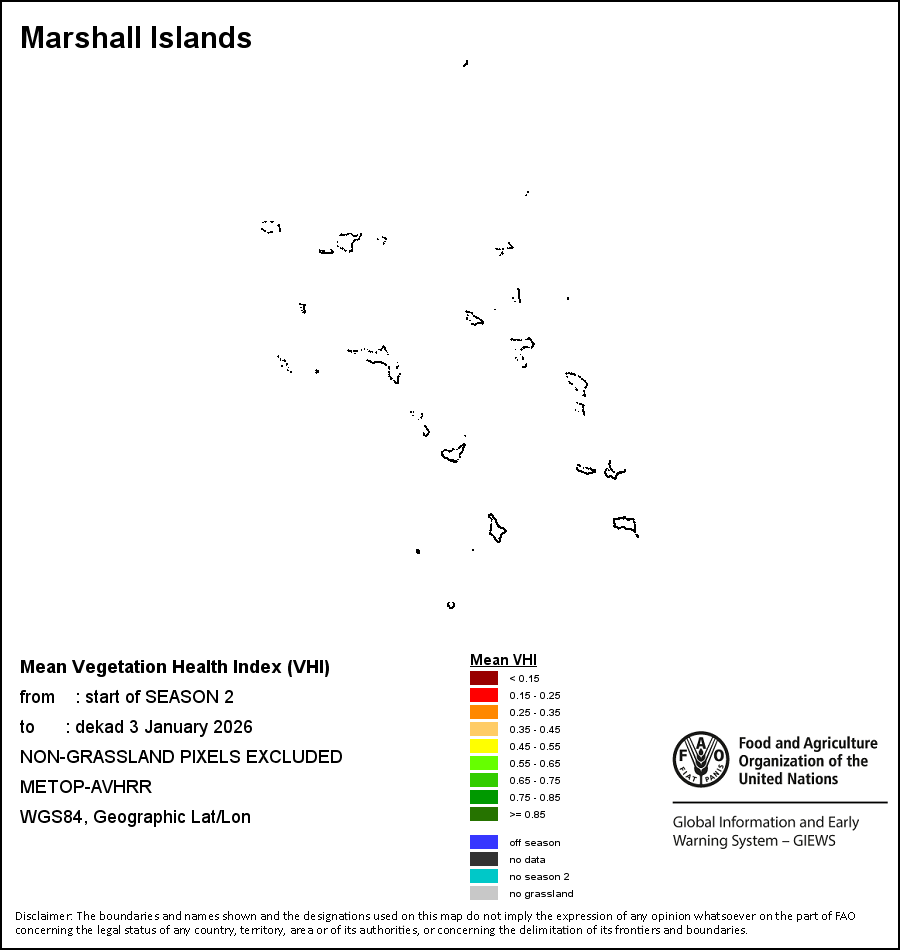 На картах и графиках на уровне страны показывается последний период в 36 месяцев по сезонным показателям, показателям растительного покрова и уровня атмосферных осадков. Данные представляются по 10-дневным периодам и по месяцам. Все три показателя растительного покрова основаны на 10-дневных данных по растительному покрову, полученных от сенсора METOR-AVHRR при разрешении в 1 км (начиная с 2007 года). Данные при разрешении в 1 км за период 1984-2006 гг. были получены из банка данных NOAA-AVHRR при разрешении в 16 км. Оценки атмосферных осадков для всех африканских стран (за исключением Кабо-Верде и Маврикия) получены из системы NOAA/Системы раннего предупреждения об опасности голода (разрешении в 16 km), а по остальным странам данные получены из системы ECMWF (разрешении в 25 km). Благодаря более высокой разрешающей способности показателей состояния растительного покрова (например, NDVI, VHI) по сравнению с показателями осадков, у некоторых стран количество субнациональных единиц, для которых можно получить действительную статистику по данным показателям, больше, чем по показателям осадков.