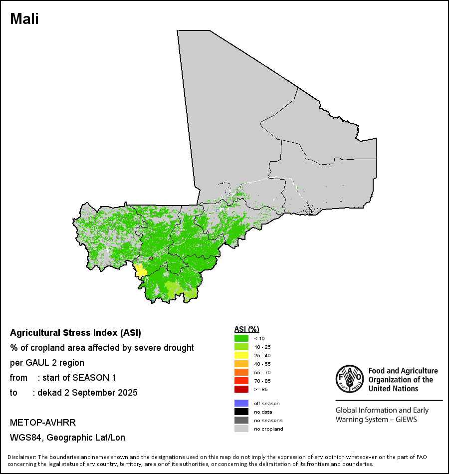 农业干旱胁迫指数(ASI)是一项速览指数,有助于在早期甄别较大可能发生水胁迫(干旱)的耕地。 该指数通过整合植被健康指数(VHI)在评估农业旱情方面具有关键意义的两个维度,即时间和空间维度,而得出。计算农业干旱胁迫指数的第一步是求植被健康指数的时间平均值,对作物周期内旱情的强度和时长进行像素级评估;这项计算包括采用作物系数衡量某种作物在各物候阶段对干旱胁迫的敏感度。第二步是确定旱情的空间广度,方法是计算植被健康指数值低于35%(Kogan前期研究将这一数值确定为评估干旱程度的临界值,1995年)的耕地的像素百分比。然后把各个行政区域根据受影响面积的百分比进行划分,便于对结果进行快速解读。