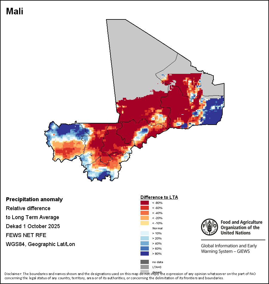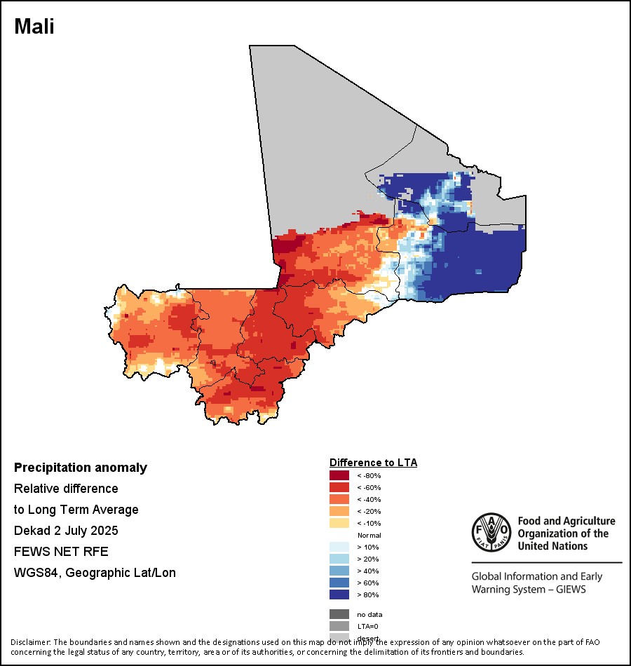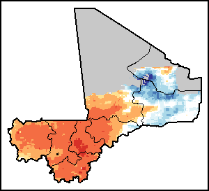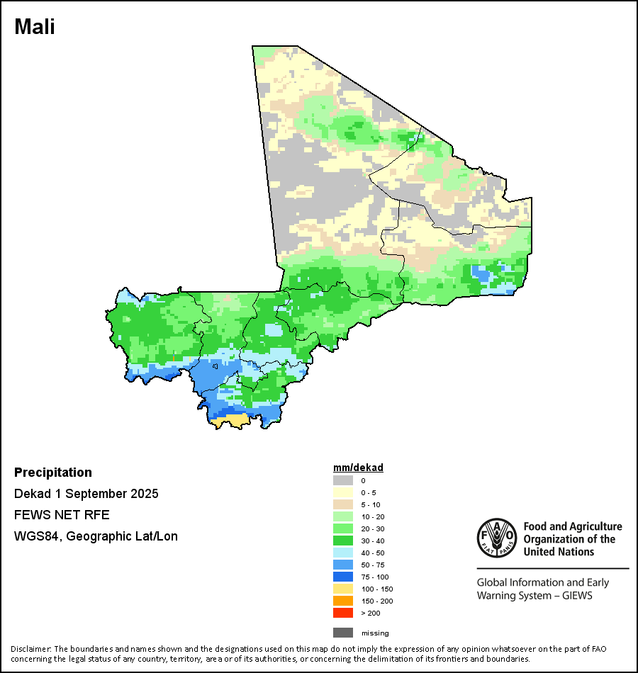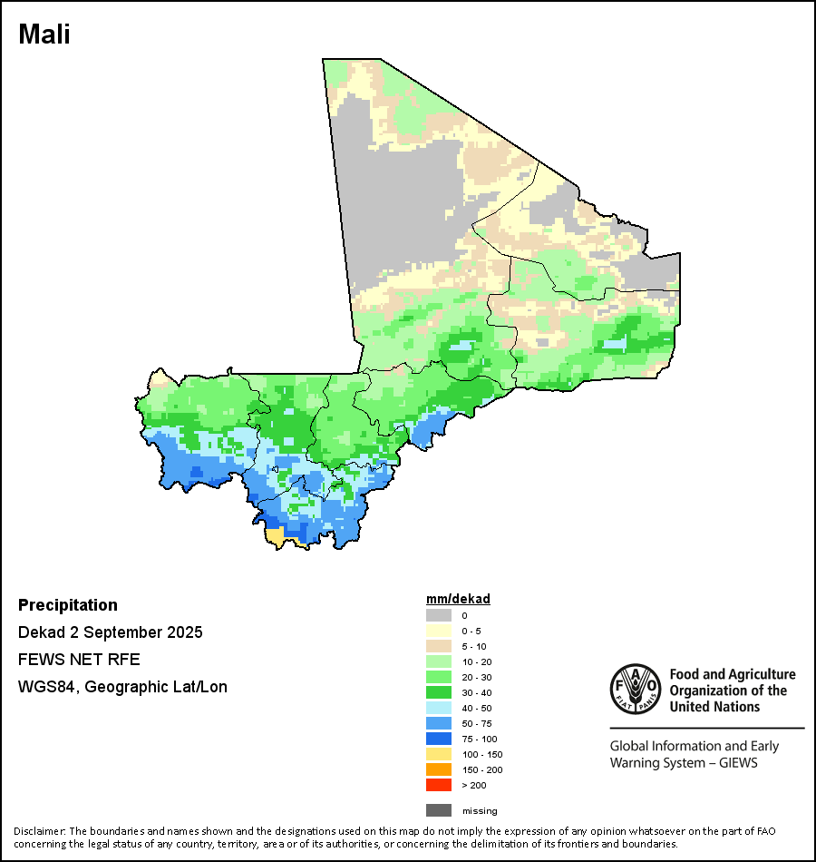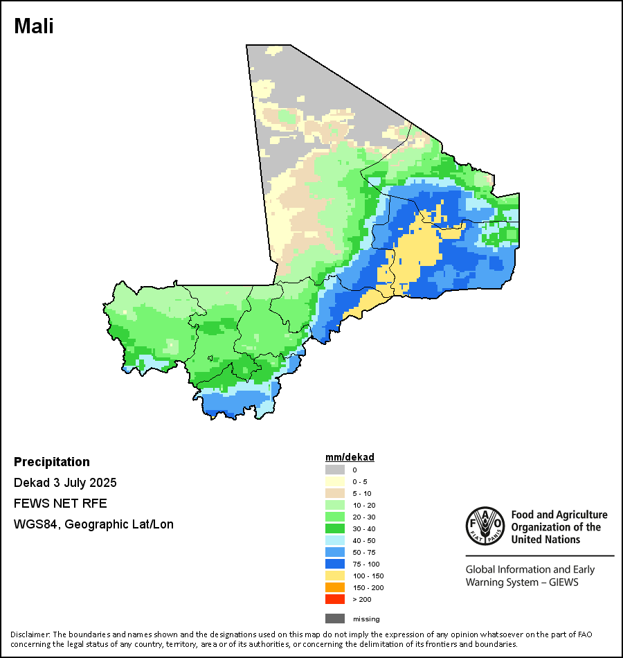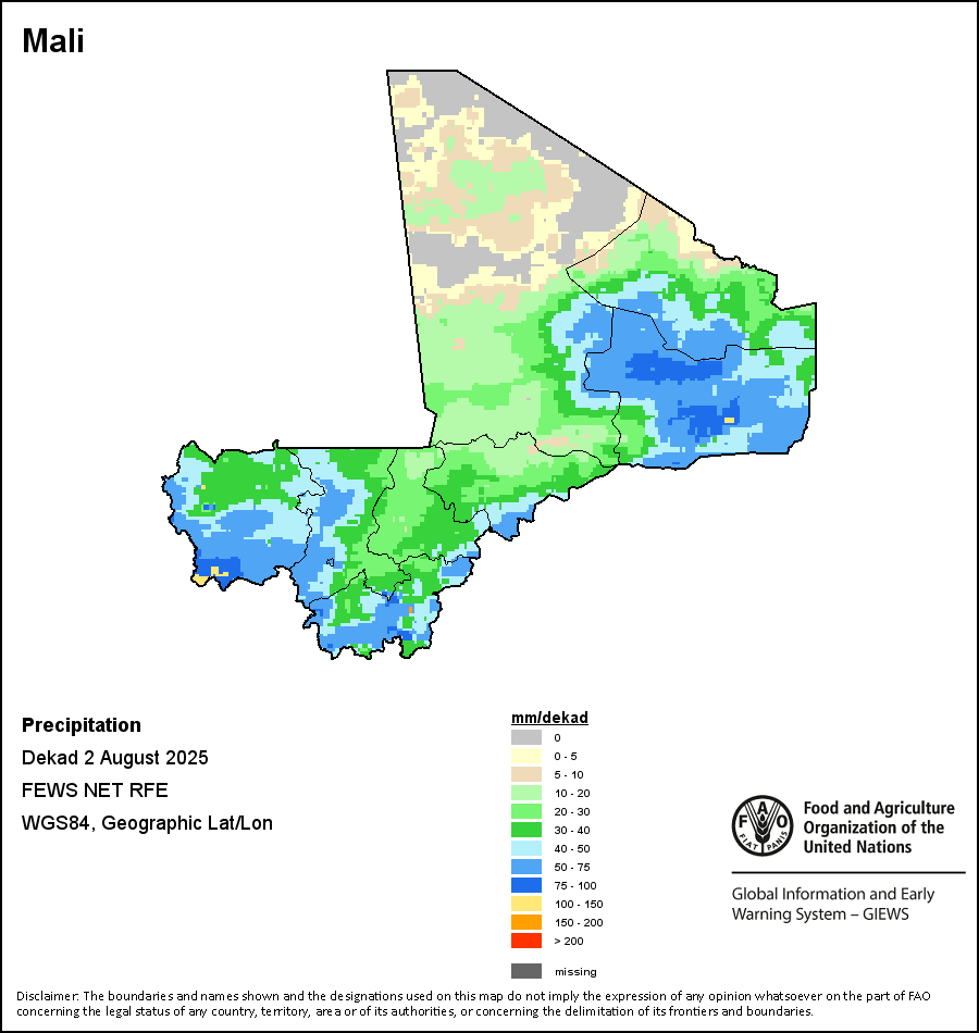 该图谱显示了每一旬(十天)的累积降水量。 所有非洲国家的降水量估算(除佛得角和毛里求斯外)均取自NOAA/FEWSNet,其他国家则取自ECMWF。