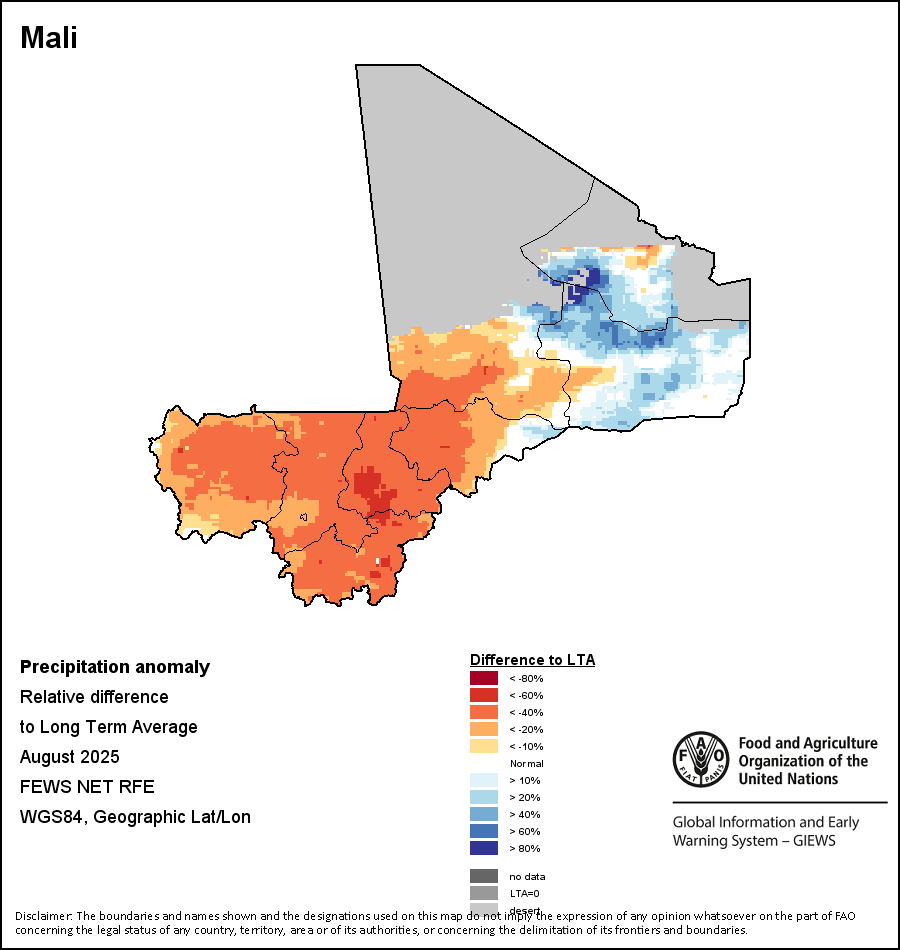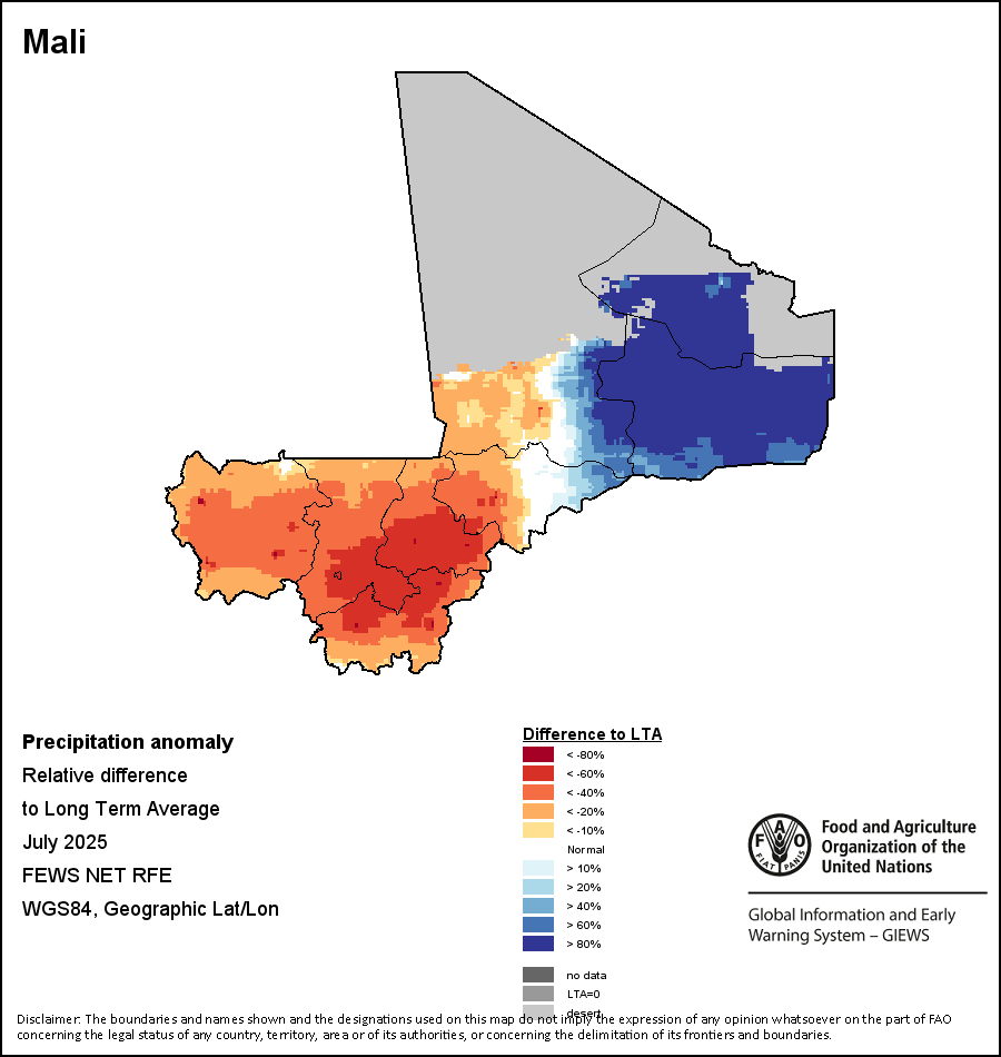 该图谱显示了当前降水量与平均水平之间的差异。 由降水量水平与长期平均值(LTA)进行比较得出,长期平均值系指1989-2015年期间的数值。暖色调指示的是降水量低于平均水平的地区,而冷色调指示的则是降水量高于平均水平的地区。降雨量估算数据来自欧洲中期天气预报这些(ECMWF)。