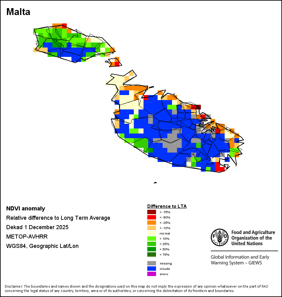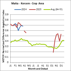The Normalized Difference Vegetation Index (NDVI) measures the “greenness” of ground cover and is used as a proxy to indicate the density and health of vegetation. NDVI values range from +1 to -1, with high positive values corresponding to dense and healthy vegetation, and low and/or negative NDVI values indicating poor vegetation conditions or sparse vegetative cover. The NDVI anomaly indicates the variation of the current dekad to the long-term average, where a positive value (for example 20 percent) would signify enhanced vegetation conditions compared to the average, while a negative value (for instance -40 percent) would indicate comparatively poor vegetation conditions.