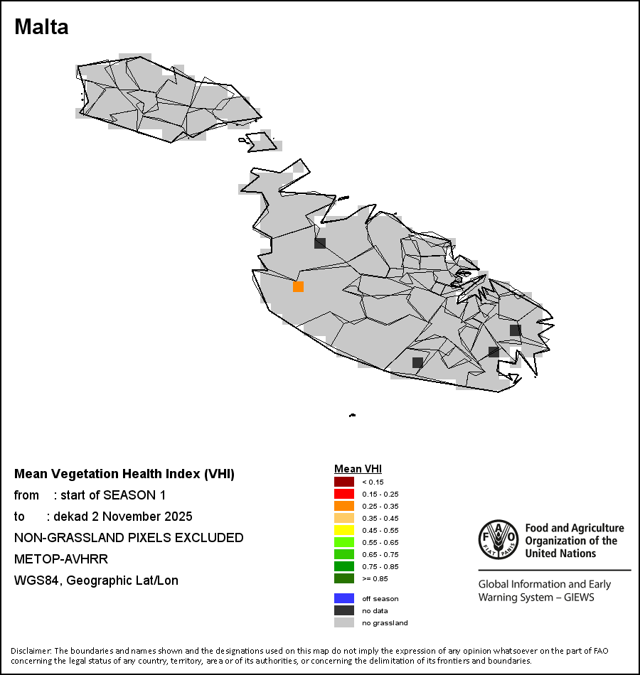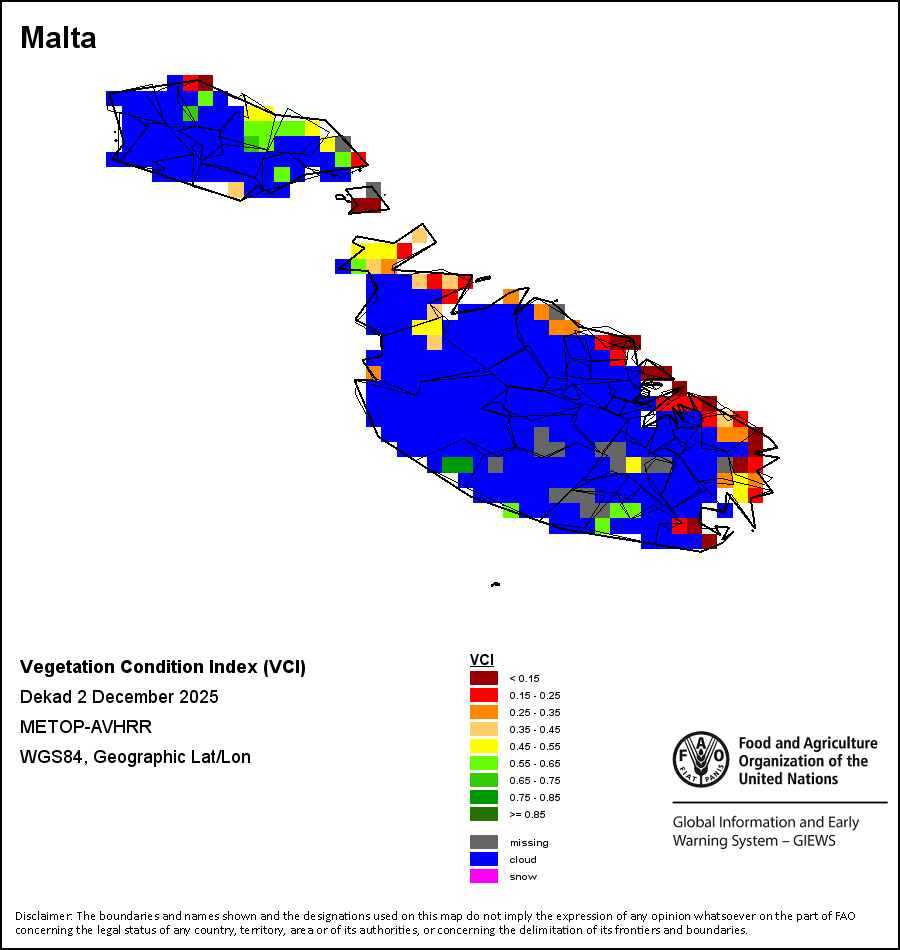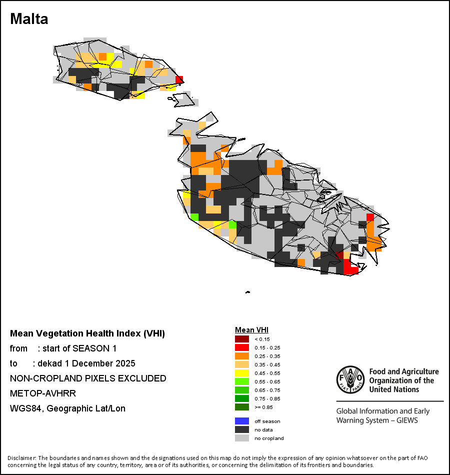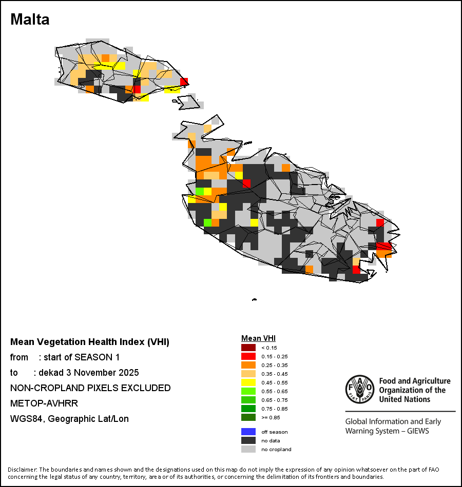 The country level maps and graphs depict the latest 36-month period of the seasonal, vegetation and precipitation indicators. The data is presented by dekad and month. All three vegetation indicators are based on 10-day (dekadal) vegetation data from the METOP-AVHRR sensor at 1 km resolution (2007 and after). Data at 1 km resolution for the period 1984-2006 are derived from the NOAA-AVHRR dataset at 16 km resolution. Precipitation estimates for all African countries (except Cabo Verde and Mauritius) are taken from NOAA/FEWSNet (16 km resolution), while for the remaining countries data is obtained from ECMWF (25 km resolution). Owing to the higher resolution of vegetation indicators (e.g., NDVI, VHI) compared to coarser precipitation indicators, the number of sub-national units for which valid zonal statistics can be generated for vegetation indices is greater than the number of units for precipitation indicators for certain countries.