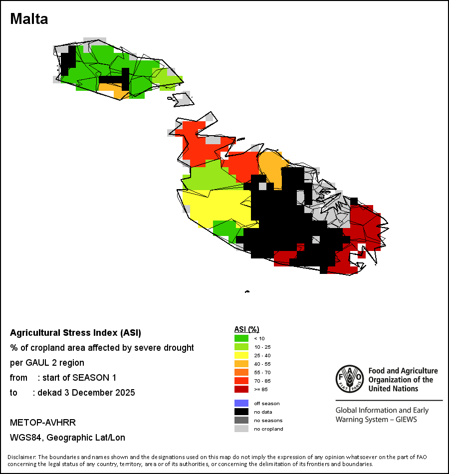 The Agricultural Stress Index (ASI) is a quick-look indicator that facilitates the early identification of cropped land with a high likelihood of water stress (drought). The Index is based on the integration of the Vegetation Health Index (VHI) in two dimensions that are critical in the assessment of a drought event in agriculture: temporal and spatial. The first step of the ASI calculation is a temporal averaging of the VHI, assessing the intensity and duration of dry periods occurring during the crop cycle at the pixel level; this calculation includes the use of crop coefficients, which introduces sensitivity of a crop to water stress during each phenological phase. The second step determines the spatial extent of drought events by calculating the percentage of pixels in arable areas with a VHI value below 35 percent (this value was identified as a critical threshold in assessing the extent of drought in previous research by Kogan, 1995). Each administrative area is classified according to the percentage of the affected area to facilitate the quick interpretation of results.