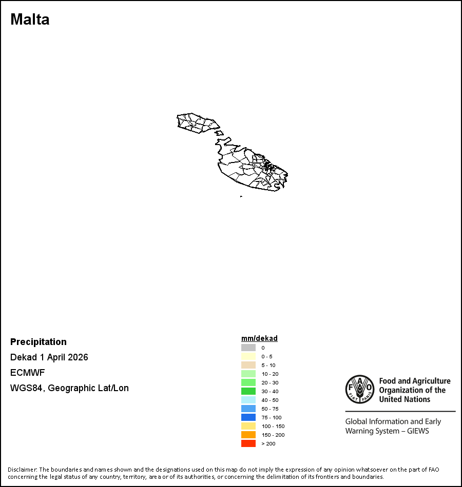 The map depicts cumulative rainfall volumes over a dekad (a 10-day period). Precipitation estimates for all African countries (except Cabo Verde and Mauritius) are taken from NOAA/FEWSNet, while for the remaining countries data is obtained from ECMWF.