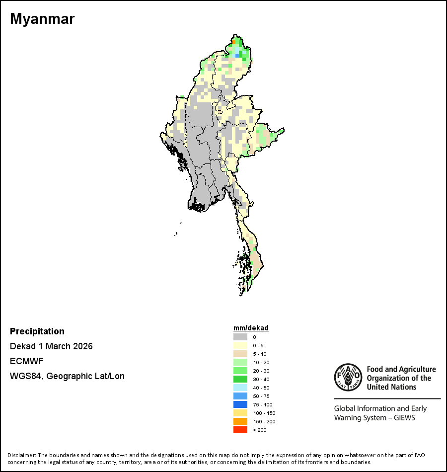 The map depicts cumulative rainfall volumes over a dekad (a 10-day period). Precipitation estimates for all African countries (except Cabo Verde and Mauritius) are taken from NOAA/FEWSNet, while for the remaining countries data is obtained from ECMWF.