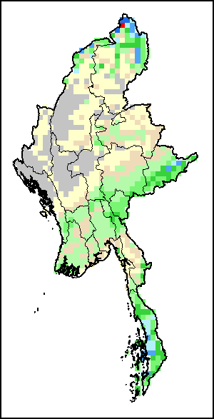 The Normalized Difference Vegetation Index (NDVI) measures the “greenness” of ground cover and is used as a proxy to indicate the density and health of vegetation. NDVI values range from +1 to -1, with high positive values corresponding to dense and healthy vegetation, and low and/or negative NDVI values indicating poor vegetation conditions or sparse vegetative cover. The NDVI anomaly indicates the variation of the current dekad to the long-term average, where a positive value (for example 20 percent) would signify enhanced vegetation conditions compared to the average, while a negative value (for instance -40 percent) would indicate comparatively poor vegetation conditions.