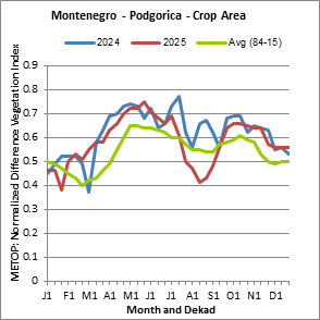 The Normalized Difference Vegetation Index (NDVI) measures the “greenness” of ground cover and is used as a proxy to indicate the density and health of vegetation. NDVI values range from +1 to -1, with high positive values corresponding to dense and healthy vegetation, and low and/or negative NDVI values indicating poor vegetation conditions or sparse vegetative cover. The NDVI anomaly indicates the variation of the current dekad to the long-term average, where a positive value (for example 20 percent) would signify enhanced vegetation conditions compared to the average, while a negative value (for instance -40 percent) would indicate comparatively poor vegetation conditions.