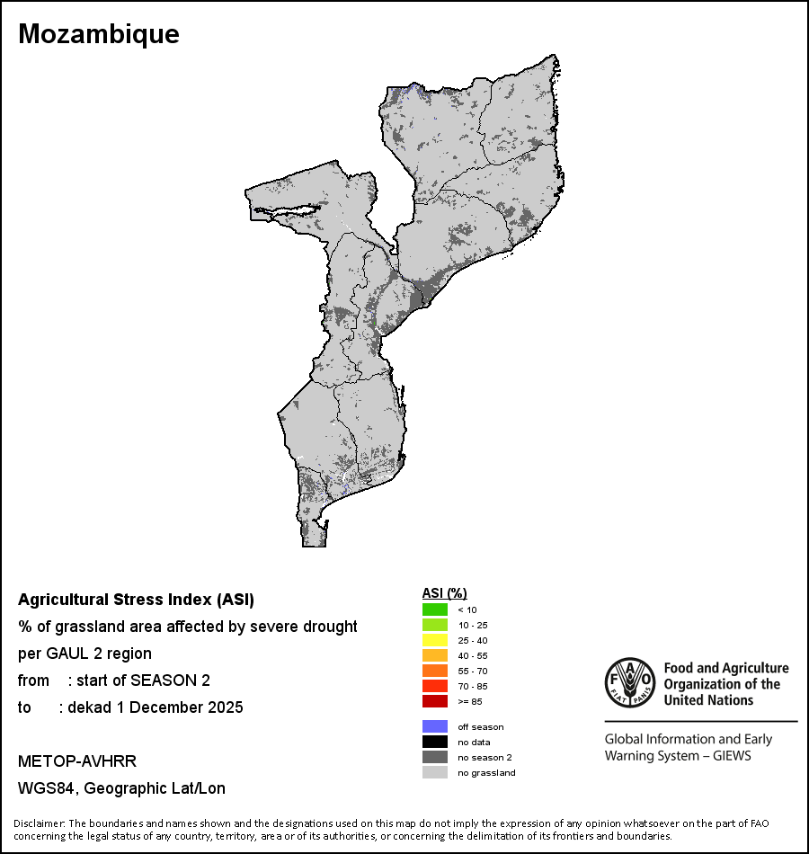 The Agricultural Stress Index (ASI) is a quick-look indicator that facilitates the early identification of cropped land with a high likelihood of water stress (drought). The Index is based on the integration of the Vegetation Health Index (VHI) in two dimensions that are critical in the assessment of a drought event in agriculture: temporal and spatial. The first step of the ASI calculation is a temporal averaging of the VHI, assessing the intensity and duration of dry periods occurring during the crop cycle at the pixel level; this calculation includes the use of crop coefficients, which introduces sensitivity of a crop to water stress during each phenological phase. The second step determines the spatial extent of drought events by calculating the percentage of pixels in arable areas with a VHI value below 35 percent (this value was identified as a critical threshold in assessing the extent of drought in previous research by Kogan, 1995). Each administrative area is classified according to the percentage of the affected area to facilitate the quick interpretation of results.