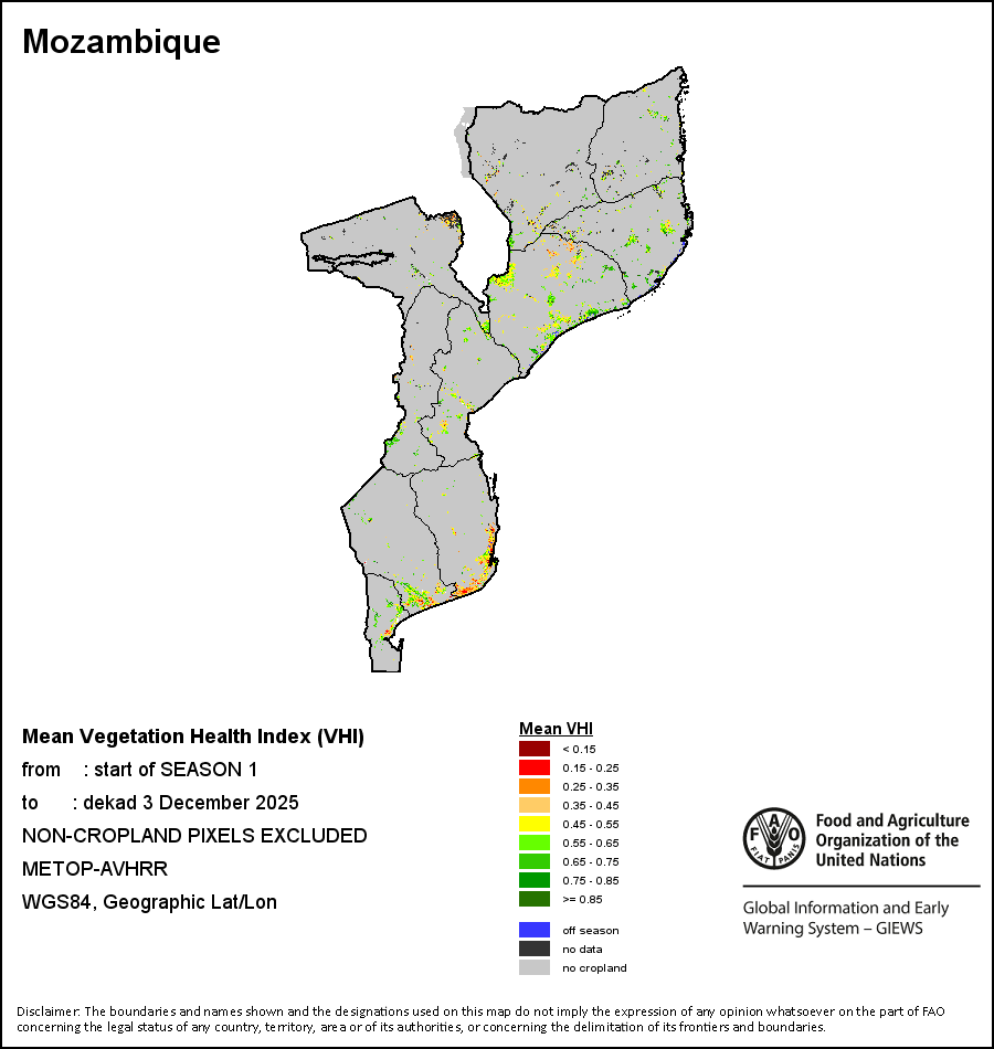 The country level maps and graphs depict the latest 36-month period of the seasonal, vegetation and precipitation indicators. The data is presented by dekad and month. All three vegetation indicators are based on 10-day (dekadal) vegetation data from the METOP-AVHRR sensor at 1 km resolution (2007 and after). Data at 1 km resolution for the period 1984-2006 are derived from the NOAA-AVHRR dataset at 16 km resolution. Precipitation estimates for all African countries (except Cabo Verde and Mauritius) are taken from NOAA/FEWSNet (16 km resolution), while for the remaining countries data is obtained from ECMWF (25 km resolution). Owing to the higher resolution of vegetation indicators (e.g., NDVI, VHI) compared to coarser precipitation indicators, the number of sub-national units for which valid zonal statistics can be generated for vegetation indices is greater than the number of units for precipitation indicators for certain countries.