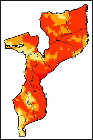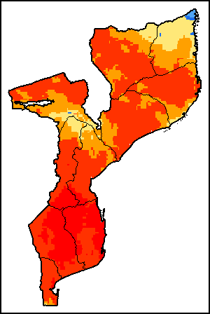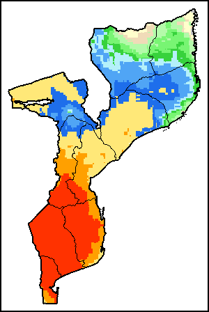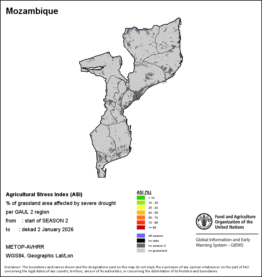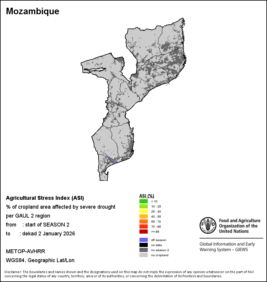 L'indice de stress hydrique (ASI – Agricultural Stress Index) est un indicateur qui facilite l'identification précoce des terres cultivées souffrant probablement de stress hydrique (sécheresse). L’indice se base sur l'Indice de santé de la végétation (VHI – Vegetation Health Index) auquel sont intégrées les dimensions espace-temps, essentielles pour évaluer un épisode de sécheresse dans le contexte agricole. La première étape du calcul de l’ASI consiste à établir une moyenne temporelle du VHI, en évaluant l'intensité et la durée des périodes de sécheresse se produisant pendant le cycle de culture au niveau du pixel; ce calcul comprend l'utilisation de coefficients de culture, qui permettent de tenir compte de la sensibilité d’une culture au stress hydrique pendant chaque phase phénologique. La deuxième étape consiste à déterminer l'étendue spatiale des épisodes de sécheresse en calculant le pourcentage de pixels dans les zones arables pour lequel la valeur du VHI est inférieure à 35 pour cent (cette valeur a été identifiée comme seuil critique dans l'évaluation de l'étendue de la sécheresse lors de précédentes recherches, Kogan, 1995). Enfin, chaque zone administrative est classée selon son pourcentage de superficie touchée afin de faciliter une interprétation rapide des résultats.