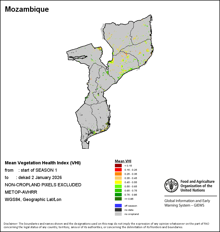 L'indice de santé de la végétation moyen pondérée (VHI moyen pondérée) permet à l'utilisateur d'évaluer la gravité de la sécheresse depuis le début de la saison de croissance et d'examiner l'état de santé de la végétation et l'influence de la température sur les conditions des plantes. Le VHI moyen pondérée est une moyenne des valeurs décadaires du VHI au cours de la saison de croissance des cultures (du début jusqu’à la dernière décade d’analyse), pondérée par les coefficients culturaux (Kc), attribués aux valeurs du VHI aux décades correspondant au début de la saison (SOS), maximum de la saison (MOS) et fin de la saison (EOS). L’application des coefficients culturaux vise à refléter la sensibilité des cultures face à un stress hydrique à différents stades phénologiques.