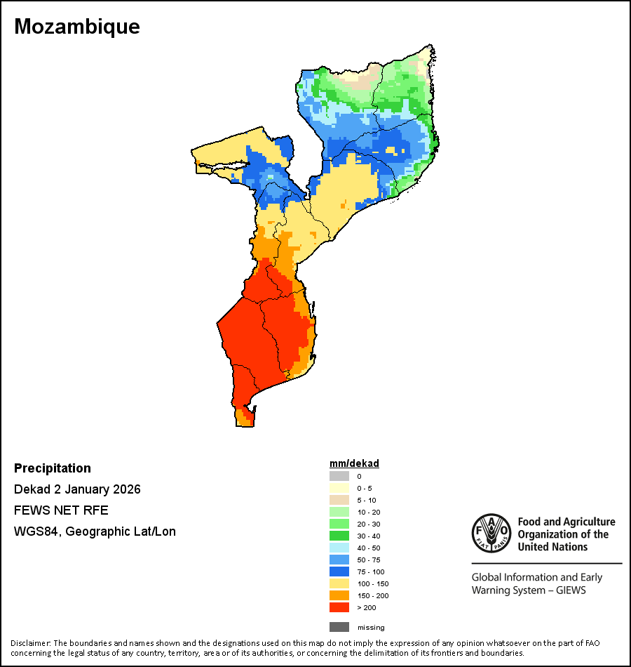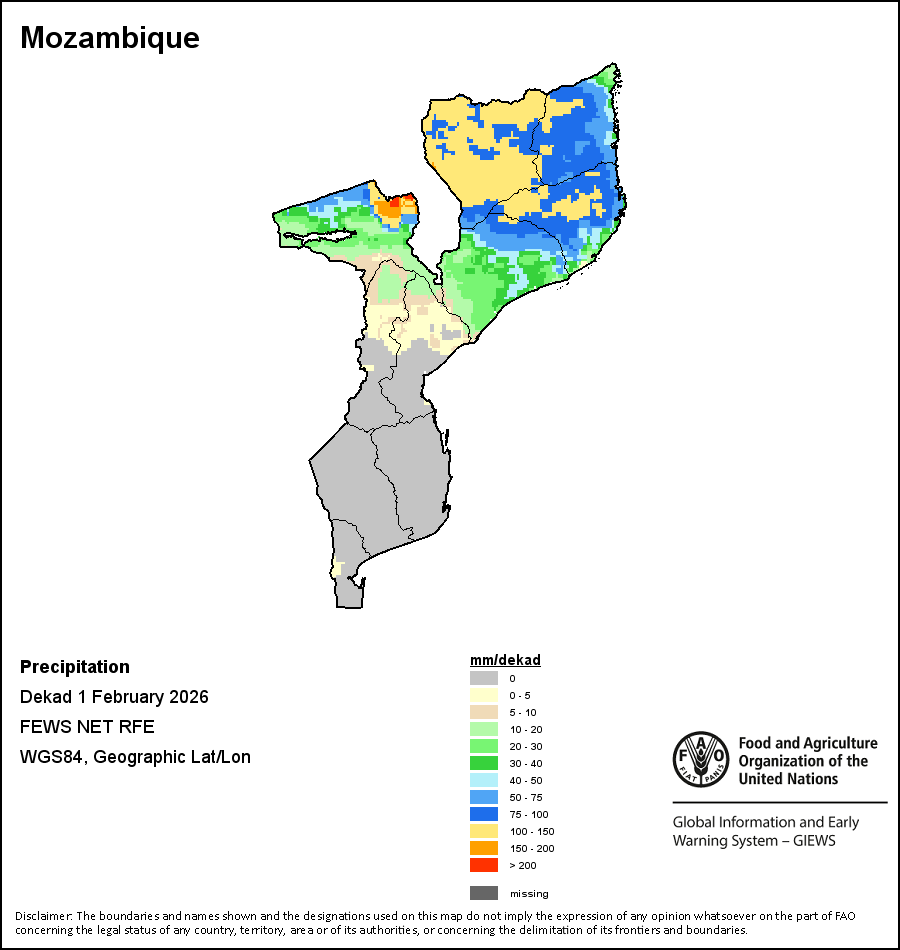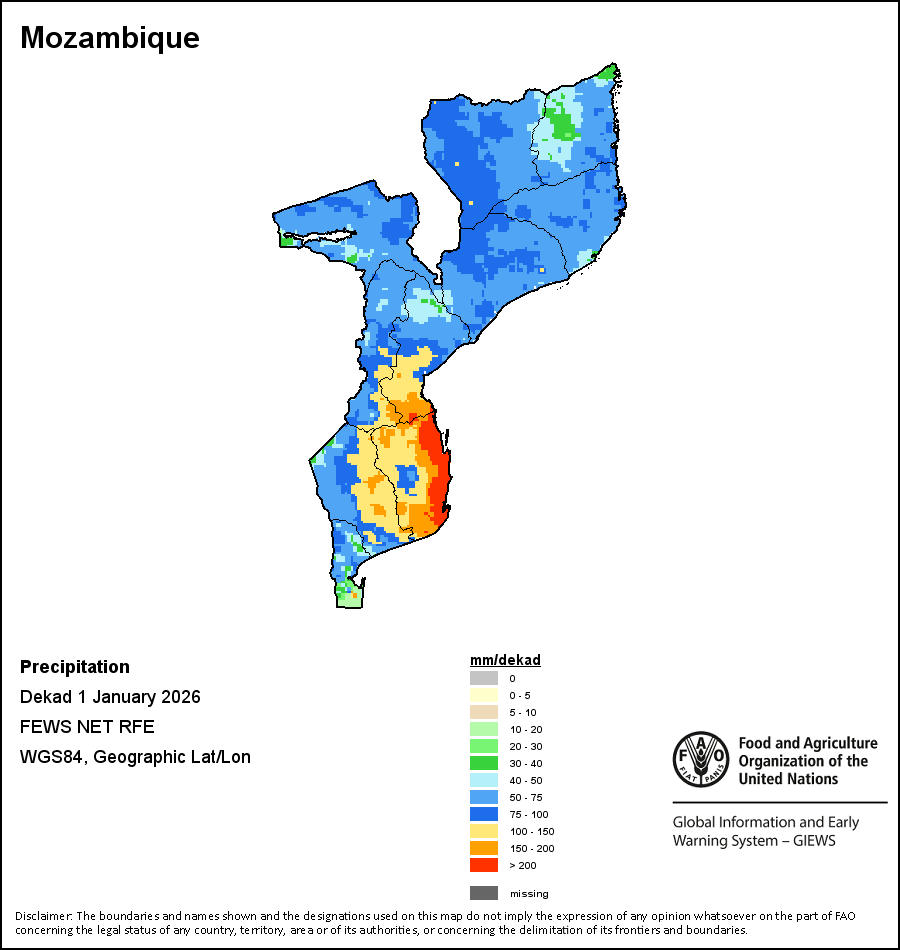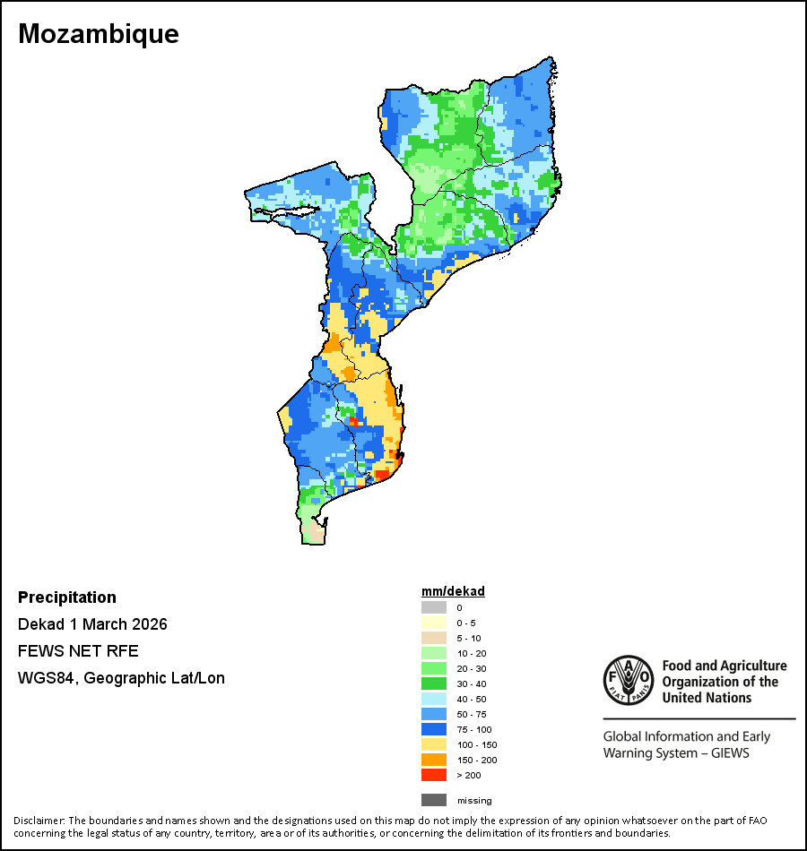 La carte illustre les volumes cumulés de précipitations au cours d’une décade (une période de 10 jours). Les estimations concernant les précipitations pour tous les pays africains (à l'exception du Cap Vert et de Maurice) proviennent du NOAA/FEWSNet, tandis que les données concernant les autres pays sont obtenues à partir du CEPMMT.