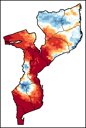 L'indice de végétation par différence normalisé (NDVI – Normalized Difference Vegetation Index) mesure la "verdeur" de la couverture du sol, et est utilisé comme indicateur de la densité et de l’état de la végétation. Les valeurs du NDVI varient de +1 à -1, plus les valeurs positives sont élevées plus la végétation est dense et en bonne santé, tandis que des valeurs faibles et/ou négatives du NDVI indiquent une végétation en mauvaises conditions ou une couverture végétale clairsemée. L’écart NDVI indique la variation de la décade actuelle par rapport à la moyenne à long terme. Une valeur positive (par exemple 20 pour cent) indique une amélioration des conditions de végétation par rapport à la moyenne, tandis qu'une valeur négative (par exemple -40 pour cent) signale des conditions de végétation relativement mauvaises.