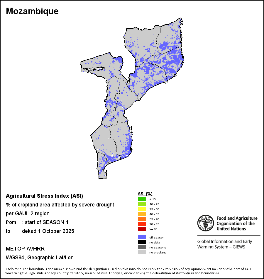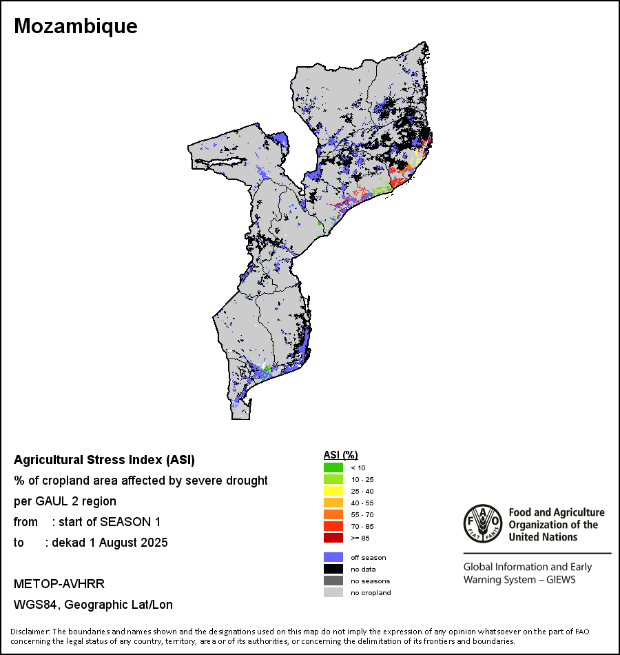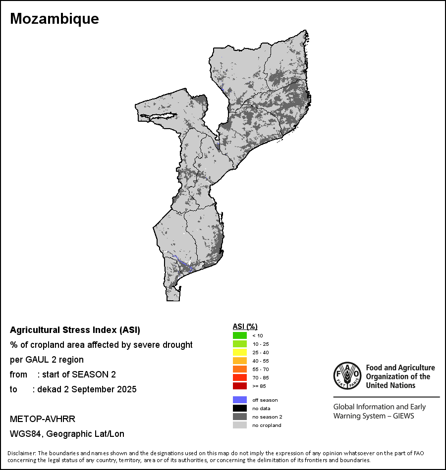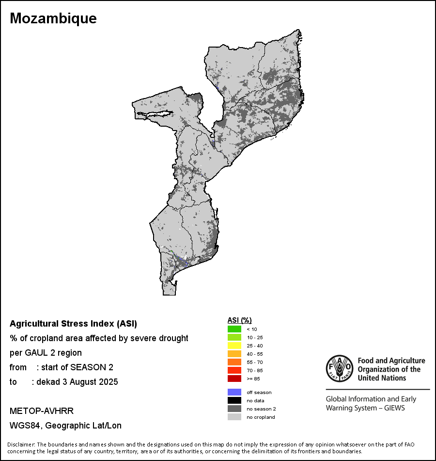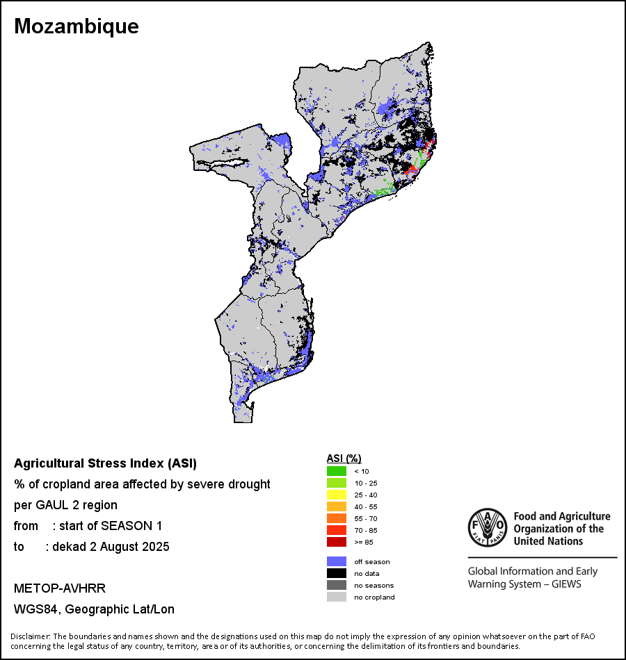 农业干旱胁迫指数(ASI)是一项速览指数,有助于在早期甄别较大可能发生水胁迫(干旱)的耕地。 该指数通过整合植被健康指数(VHI)在评估农业旱情方面具有关键意义的两个维度,即时间和空间维度,而得出。计算农业干旱胁迫指数的第一步是求植被健康指数的时间平均值,对作物周期内旱情的强度和时长进行像素级评估;这项计算包括采用作物系数衡量某种作物在各物候阶段对干旱胁迫的敏感度。第二步是确定旱情的空间广度,方法是计算植被健康指数值低于35%(Kogan前期研究将这一数值确定为评估干旱程度的临界值,1995年)的耕地的像素百分比。然后把各个行政区域根据受影响面积的百分比进行划分,便于对结果进行快速解读。