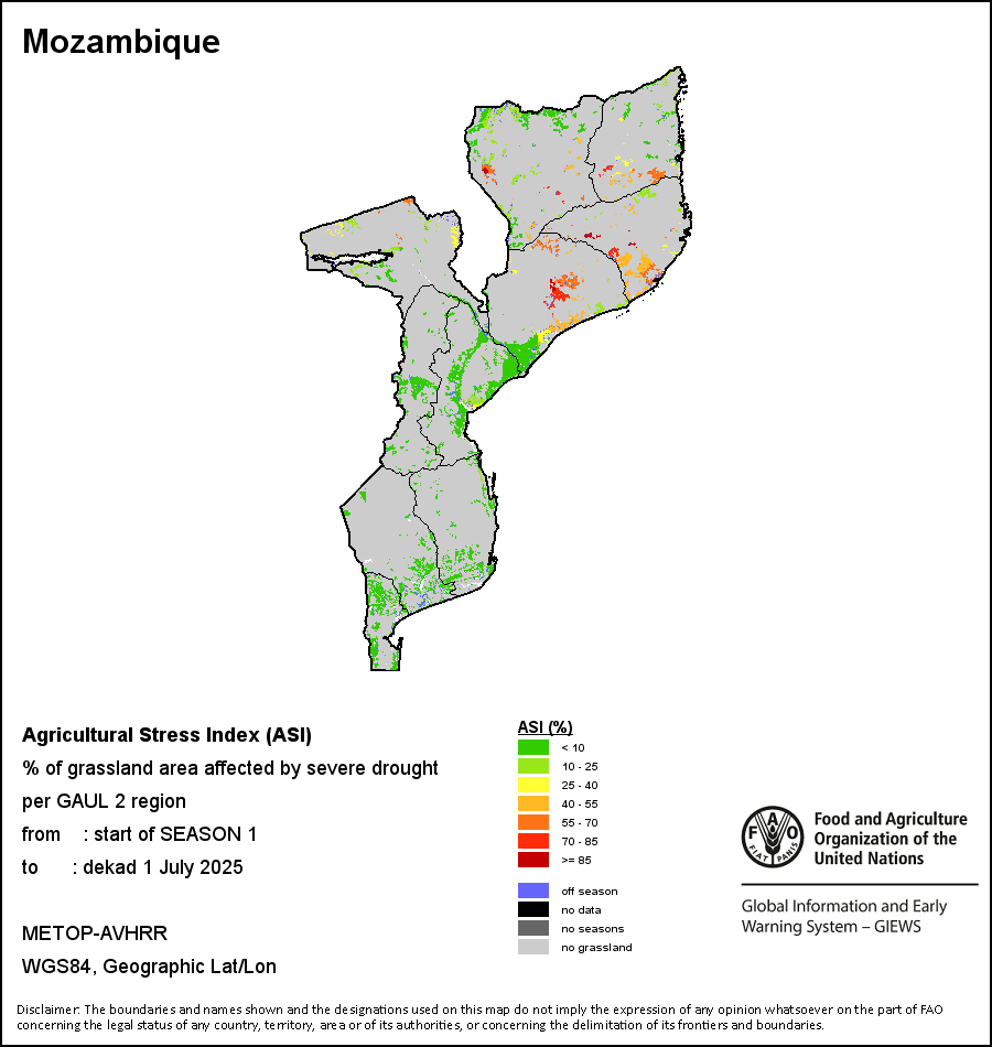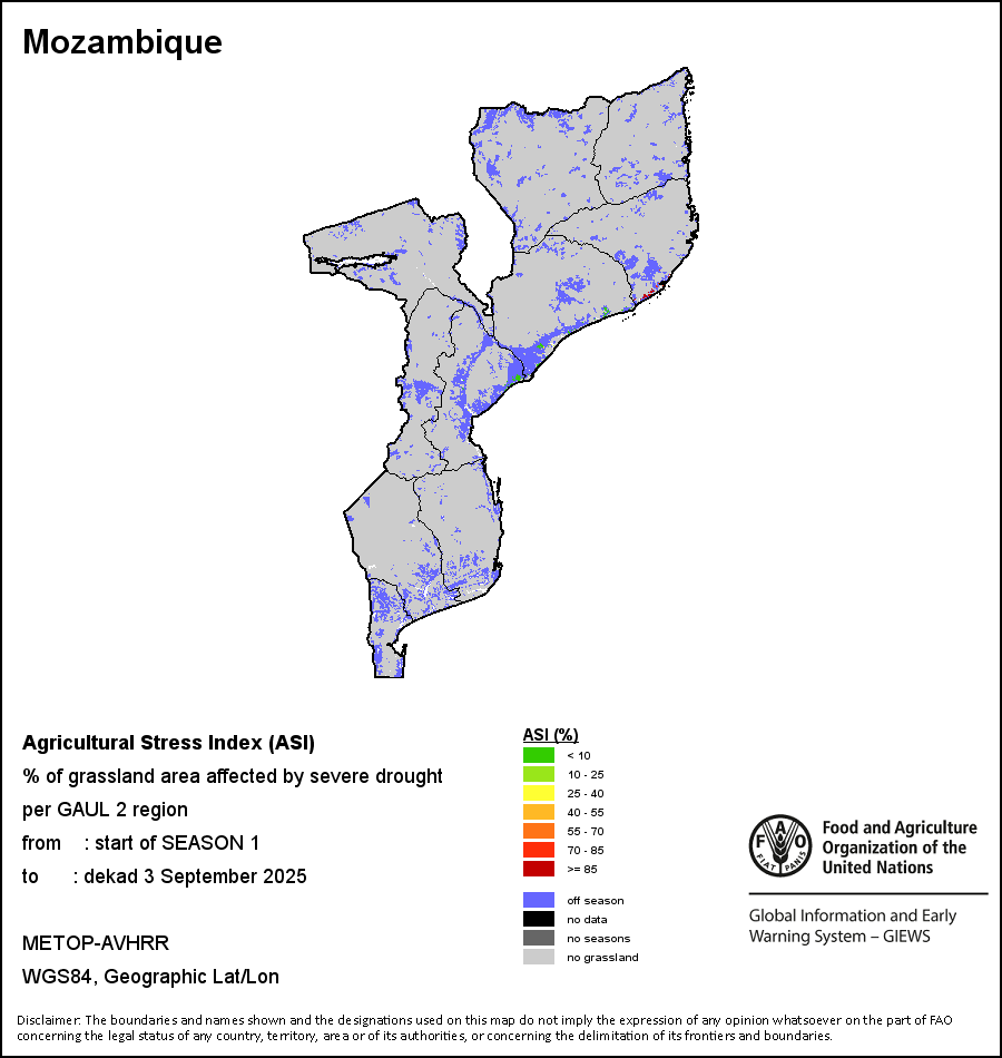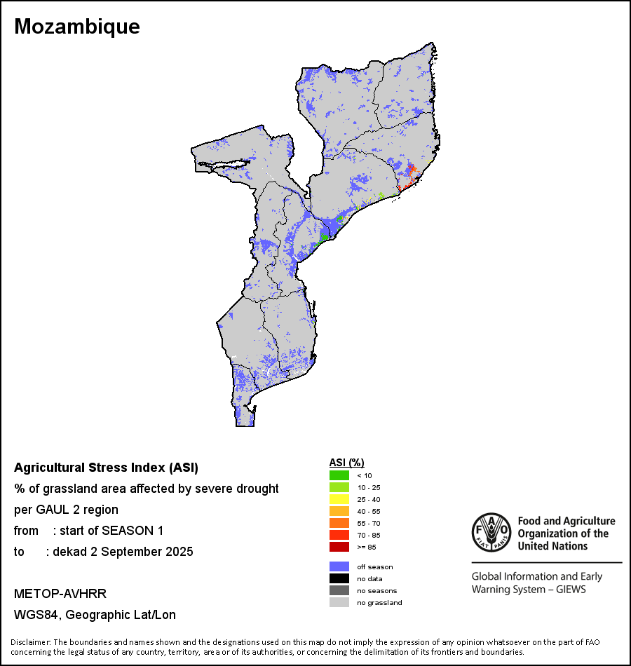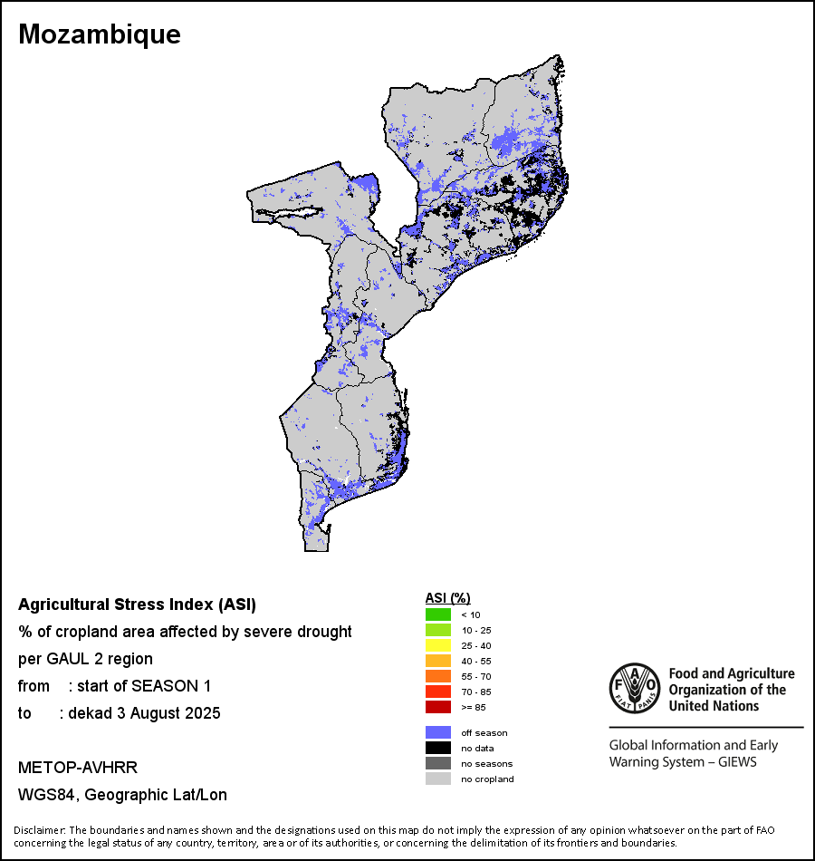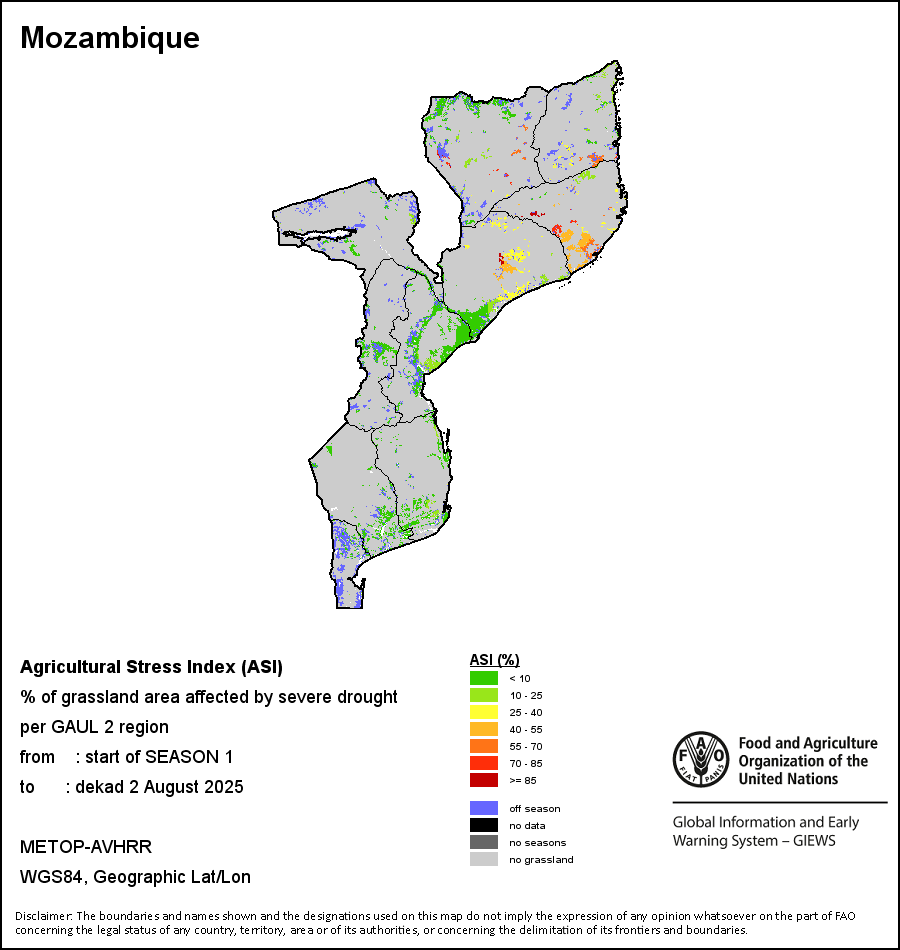 农业干旱胁迫指数(ASI)是一项速览指数,有助于在早期甄别较大可能发生水胁迫(干旱)的耕地。 该指数通过整合植被健康指数(VHI)在评估农业旱情方面具有关键意义的两个维度,即时间和空间维度,而得出。计算农业干旱胁迫指数的第一步是求植被健康指数的时间平均值,对作物周期内旱情的强度和时长进行像素级评估;这项计算包括采用作物系数衡量某种作物在各物候阶段对干旱胁迫的敏感度。第二步是确定旱情的空间广度,方法是计算植被健康指数值低于35%(Kogan前期研究将这一数值确定为评估干旱程度的临界值,1995年)的耕地的像素百分比。然后把各个行政区域根据受影响面积的百分比进行划分,便于对结果进行快速解读。