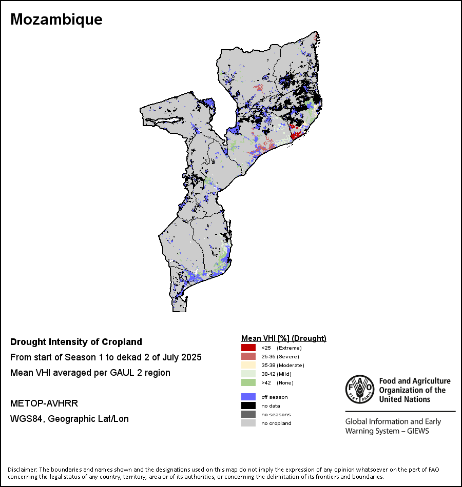 农业干旱依据其强度划分为四类:极端、严重、重度或轻度。干旱的强度通过各全球行政单位分层制度二级区域(GAUL 2)地区累积加权平均植被健康指数计算得出,意味着植被健康状况越差旱情就越严重。